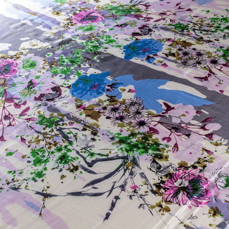 Итальянский атласный шелк с цветным растительным принтом. Вдоль кромки оформлен абстрактными полосками в тон рисунку. Можно использовать в изделии по длине ткани и объемом. Ткань средней плотности, не просвечивает, струится, хорошо драпируется. Поверхность глядкая, имеет благородный сатиновый блеск. Подойдет для смелых образов: летних платьев и сарафанов, как летящих фасонов, так и скроенных по косой, накидок, юбок, блузок, костюмов, широких брюк, домашней одежды.