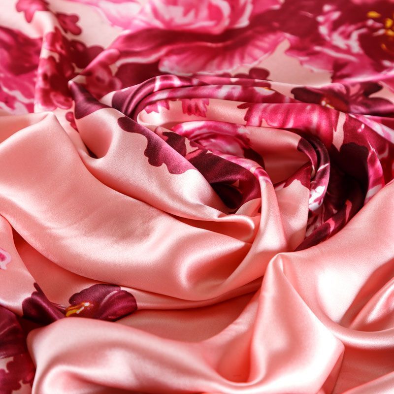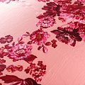 Итальянский атласный шелк с цветочным принтом на розовом фоне. Ткань тонкая, не просвечивает, отлично драпируется, легкая и струящаяся. Идеально подойдет для пошива платьев и сарафанов расклешенных моделей, с воланами, летящих юбок, топов, блузки, костюма в пижамном стиле.