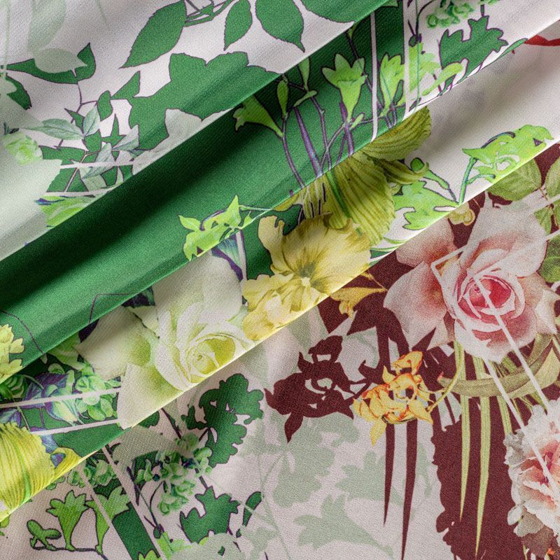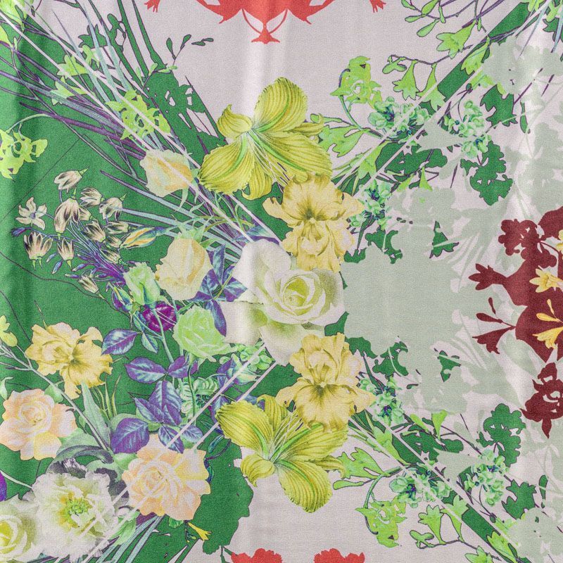 Итальянский атласный шелк со сложным растительно-геометрическим принтом. Ткань тонкая, не много просвечивает, струится, хорошо драпируется. Поверхность глядкая, имеет благородный сатиновый блеск. Подойдет для смелых образов: летних платьев и сарафанов, как летящих фасонов, так и скроенных по косой, накидок, юбок, блузок, костюмов, широких брюк, домашней одежды.