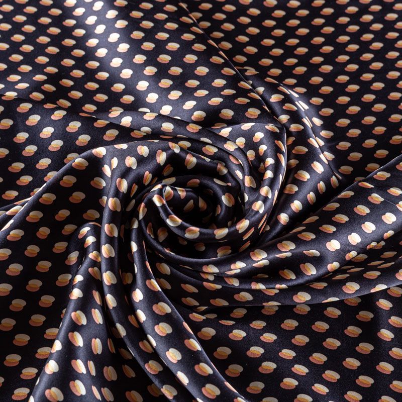 Натуральный шелк с атласной поверхностью, легкий, струящийся, хорошо драпируется. Универсальный принт выполнен в ярких оттенках, который будет уместен для пошива летнего сарафана, платья, блузки, костюма в пижамном стиле, широких брюк или юбки.