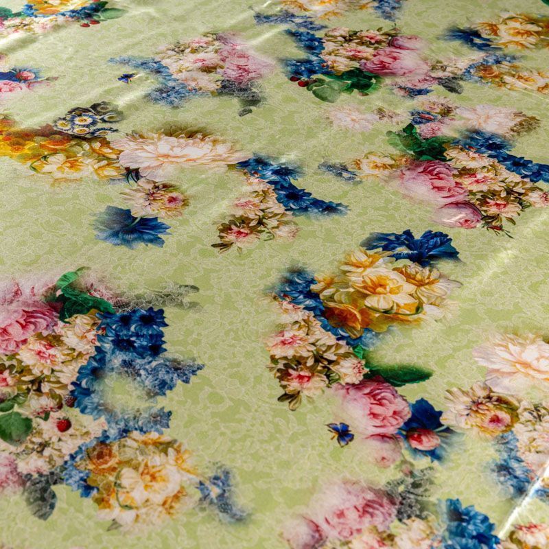 Итальянский атласный шелк с цветочным принтом на светло-салатовом фоне, имитирующем факту изысканного кружева, тонкий, слегка прозрачный, отлично драпируется,  легкий и струящийся. Идеально подойдет для пошива платьев и сарафанов расклешенных моделей, с воланами, летящих юбок, топов, блузки, костюма в пижамном стиле.