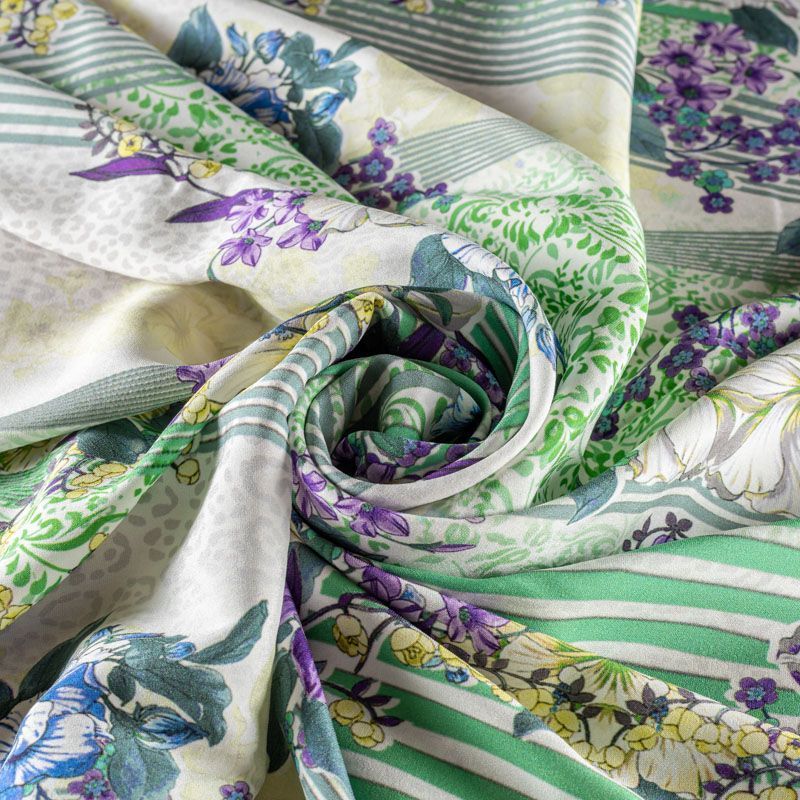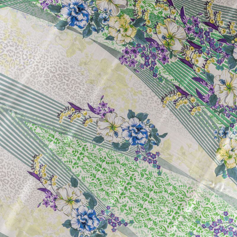 Итальянский матовый шелк с насыщенным по составу принтом: сочетание геометрических линий, анималистического и растительного рисунка на молочном фоне, тонкий, слегка прозрачный, отлично драпируется, легкий и струящийся с креповой поверхностью. Идеально подойдет для пошива платьев и сарафанов расклешенных моделей, с воланами, летящих юбок, топов, блузки, костюма в пижамном стиле, домашней одежды.