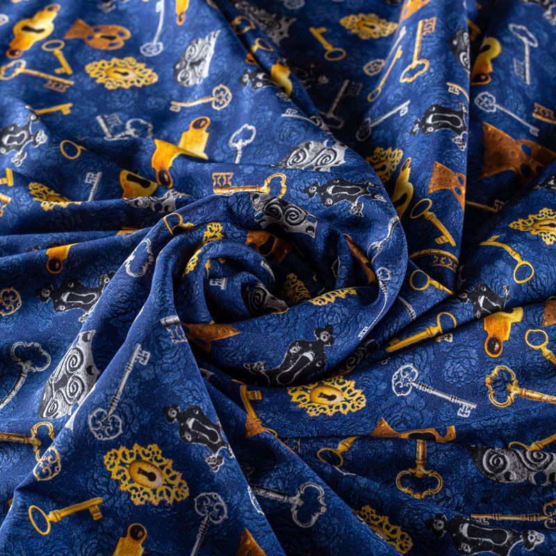 Итальянский матовый шелк насыщенного синего оттенка с узнаваемым принтом от известного бренда. Ткань тонкая, не просвечивается, отлично драпируется, легкая и струящаяся, тянется за счет эластана в составе, лицевая сторона креповая, изнанка - атласная. Идеально подойдет для пошива платьев и сарафанов расклешенных моделей, с воланами, рюшами, летящих юбок, топов, блузки, рубашки, костюма в пижамном стиле.
