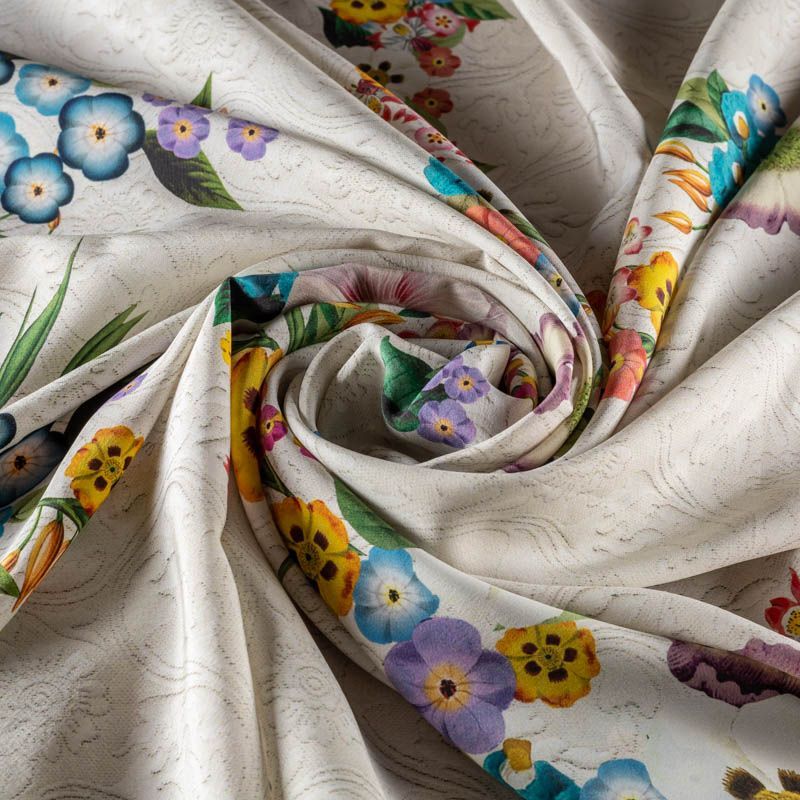 Итальянский атласный шелк с ярким цветочным принтом на фоне, имитурующем жаккардовый узор. Ткань средней плотности, не просвечивает, струится, хорошо драпируется. Поверхность гляпдкая, имеет благородный сатиновый блеск. Подойдет для летних платьев накидок, юбок, блузок, костюмов, широких брюк, домашней одежды.