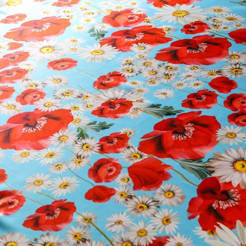 Итальянский атласный шелк, дизайн которого вдохновлен образом из коллекции известного бренда. На небесно-голубом фоне здесь - лаконичный и очень летний рисунок в виде ромашек и красных маков. Ткань средней плотности, не просвечивает, струится, хорошо драпируется. Поверхность глядкая, имеет благородный сатиновый блеск. Подойдет для летних платьев, накидок, юбок, блузок, костюмов, широких брюк, домашней одежды.