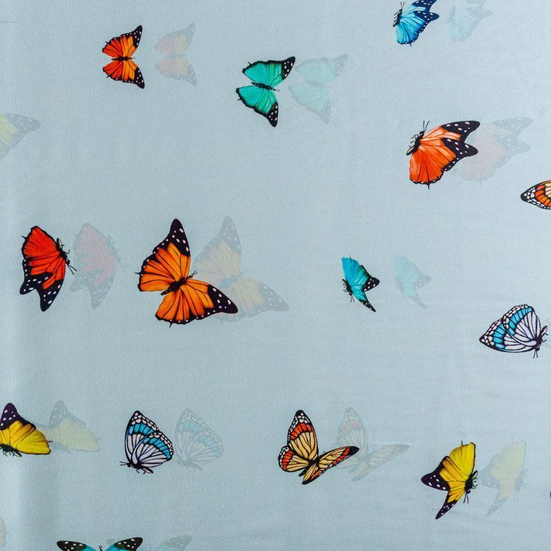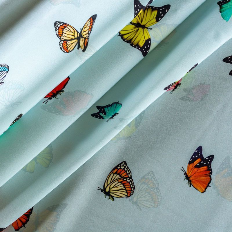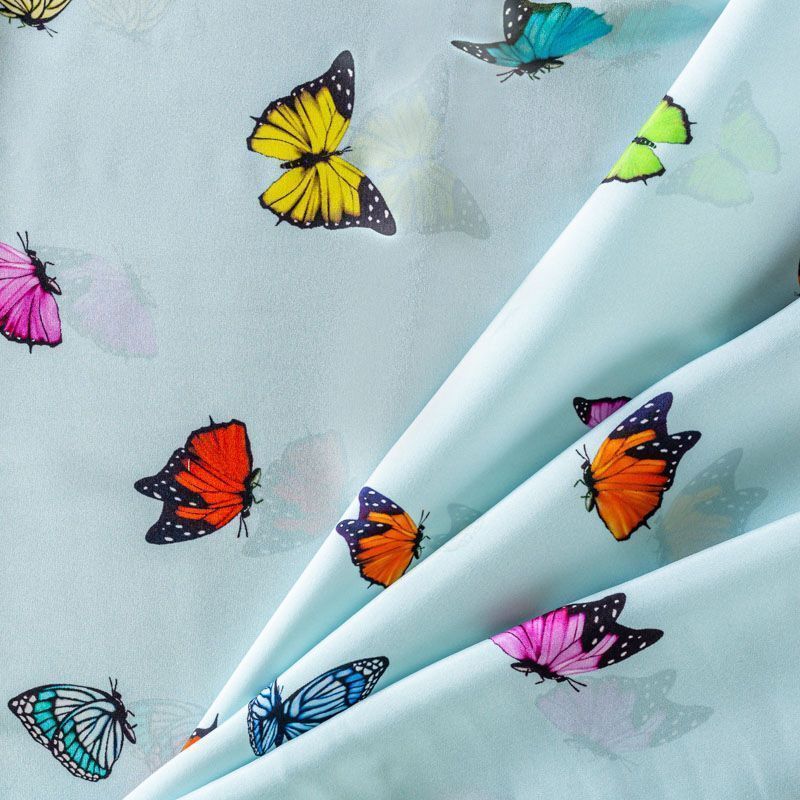 Итальянский шелк с матовой лицевой поверхностью и атласной изнанкой с анималистическим принтом на светло-голубом фоне, тонкий, слегка прозрачный, отлично драпируется, не много тянется за счет эластана в составе, легкий и струящийся. Идеально подойдет для пошива платьев и сарафанов расклешенных моделей, с воланами, летящих юбок, топов, блузки, костюма в пижамном стиле.