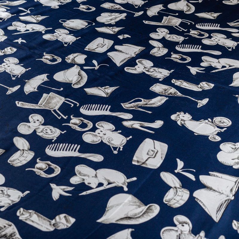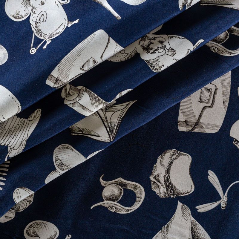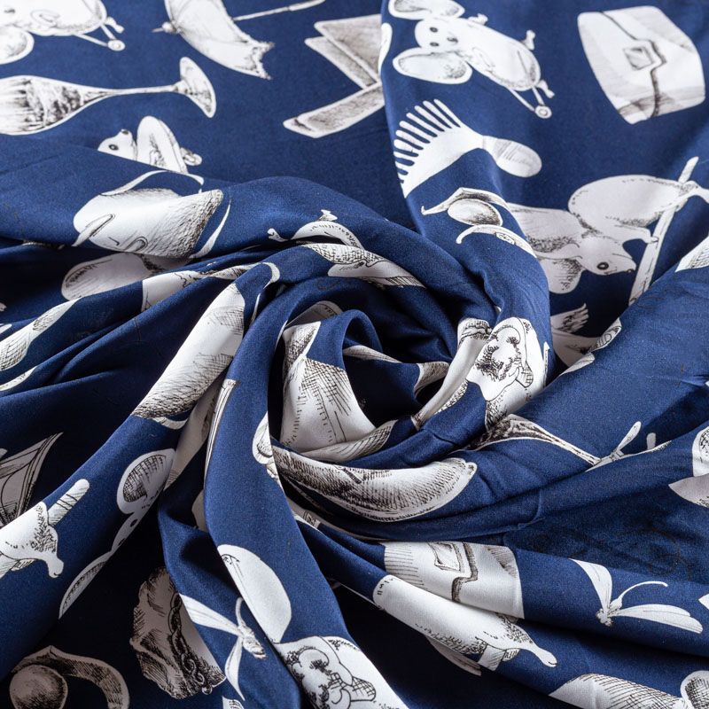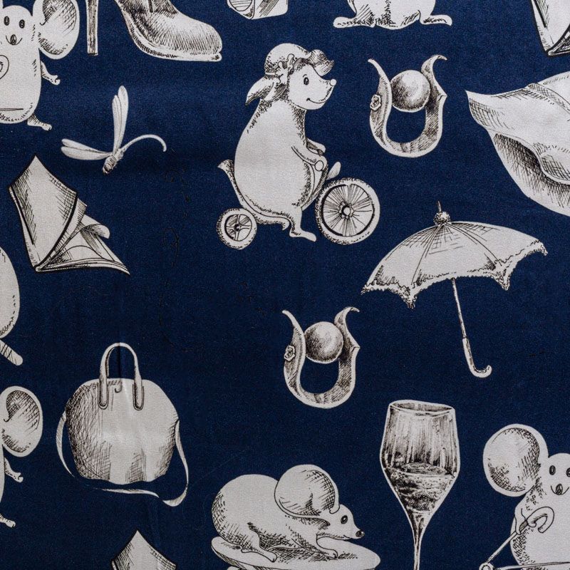 Итальянский матовый шелк глубокого оттенка сапфира с узнаваемым игривым принтом от известного бренда. Ткань тонкая, не просвечивается, отлично драпируется, легкая и струящаяся, тянется за счет эластана в составе, лицевая сторона креповая, изнанка - атласная. Идеально подойдет для пошива платьев и сарафанов расклешенных моделей, с воланами, рюшами, летящих юбок, топов, блузки, рубашки, костюма в пижамном стиле.