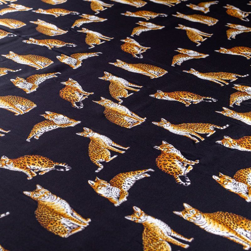 Итальянский матовый шелк черного оттенка с узнаваемым принтом диких кошек от известного бренда. Ткань тонкая, не просвечивается, отлично драпируется, легкая и струящаяся, тянется за счет эластана в составе, лицевая сторона креповая, изнанка - атласная. Идеально подойдет для пошива платьев и сарафанов расклешенных моделей, с воланами, рюшами, летящих юбок, топов, блузки, рубашки, костюма в пижамном стиле.