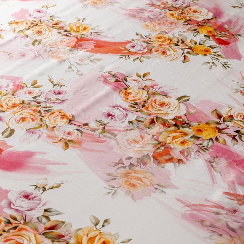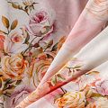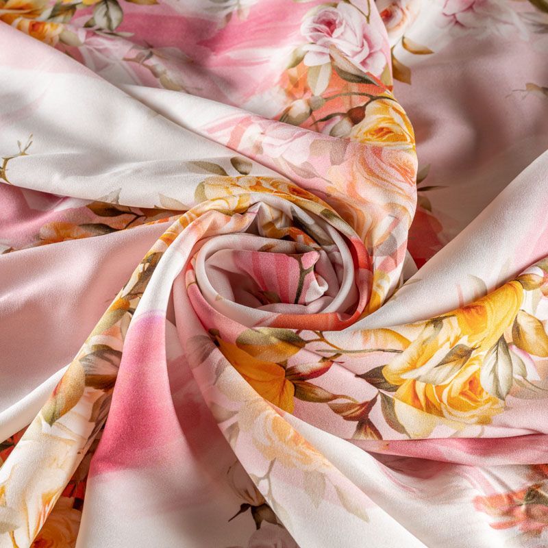 Итальянский шелк с цветочным принтом в нежных оттенках на белом фоне, тонкий, слегка прозрачный, отлично драпируется, тянется за счет эластана в составе, легкий и струящийся с атласной поверхностью. Идеально подойдет для пошива платьев и сарафанов расклешенных моделей, с воланами, летящих юбок, топов, блузы, костюма в пижамном стиле.