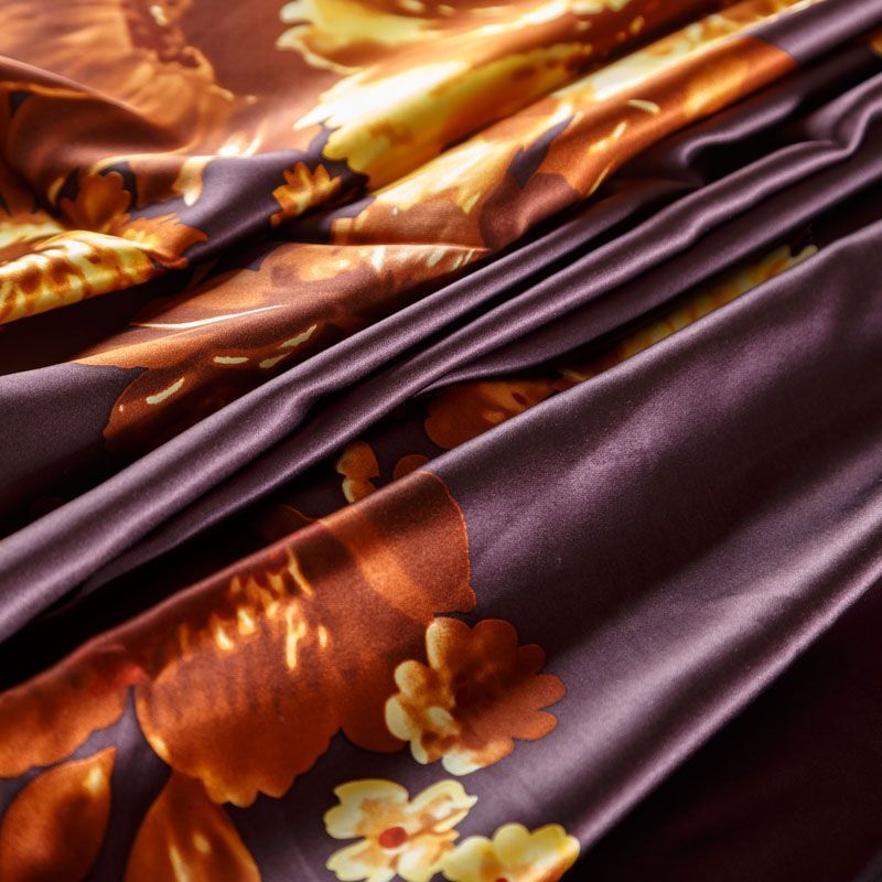 Итальянский атласный шелк с красивым цветочным принтом. Ткань средней плотности, не просвечивает, струится, хорошо драпируется. Поверхность глядкая, имеет благородный сатиновый блеск. Подойдет смелых образов: летних платьев и сарафанов, как летящих фасонов, так и скроенных по косой, накидок, юбок, блузок, костюмов, широких брюк, домашней одежды.