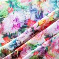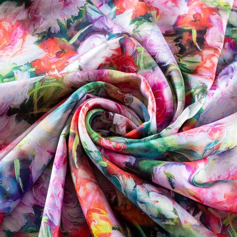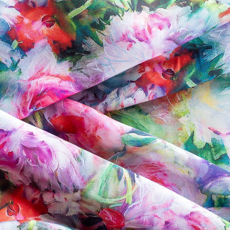 Плательно-блузочный штапель с добавлением шелка с акварельным цветочным принтом. Ткань очень мягкая, нежная, пластичная, шелковистая на ощупь, хорошо драпируется, практичная. Особенно актуальна летом, шелк-штапель очень легкий, обволакивающий прохладой. Идеален для пошива летней детской одежды, сарафанов, платьев, юбок, блузок, домашней одежды: халатов, ночной пижамы.