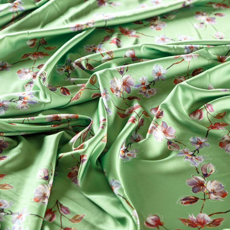 Тонкая, легкая, струящаяся ткань, не просвечивает, очень нежная и прятная к телу, обладает благородным атласным блеском, хорошо драпируется, тянется за счет эластана в составе. Идеально подойдет для пошива блузок, платьев и юбок, а также топов, платков, домашней одежды.