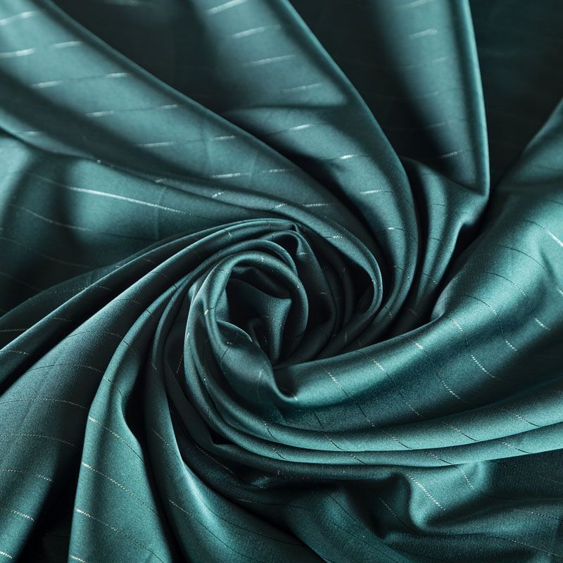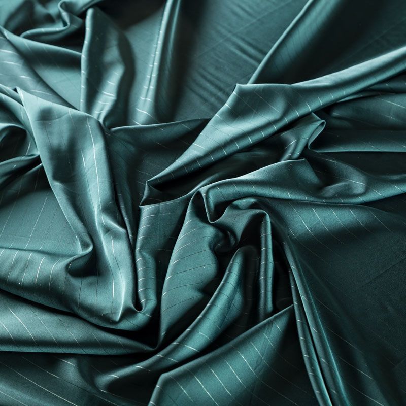 Тонкая, легкая, струящаяся ткань, декорированная тонкими вертикальными полосками люресовой нити, не просвечивает, очень нежная и прятная к телу, обладает благородным атласным блеском, хорошо драпируется, тянется за счет эластана в составе. Идеально подойдет для пошива блузок, платьев и юбок, а также топов, платков, домашней одежды.