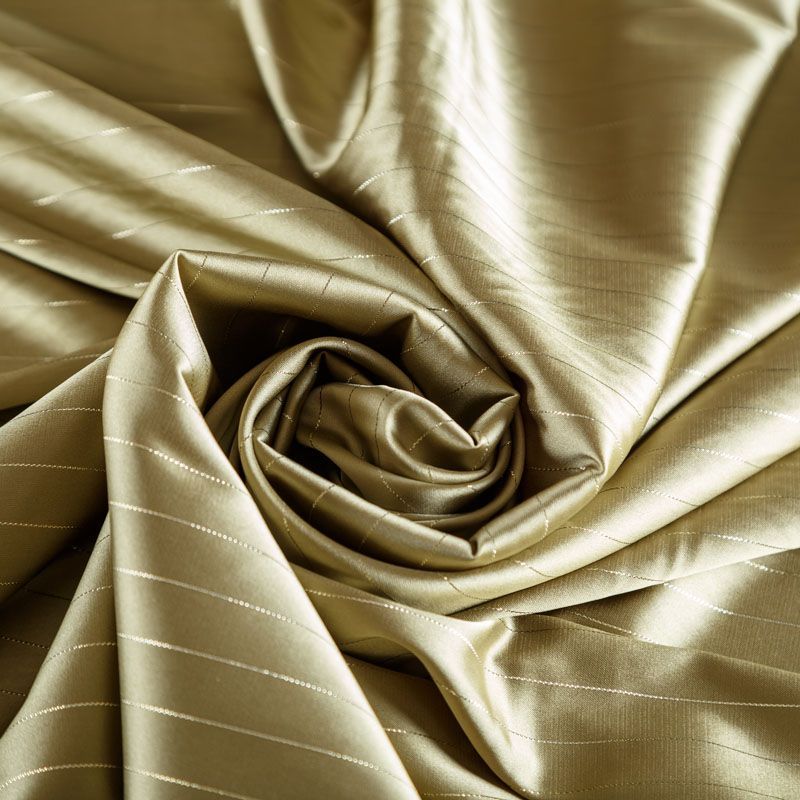 Тонкая, легкая, струящаяся ткань, декорированная тонкими вертикальными полосками люресовой нити, не просвечивает, очень нежная и прятная к телу, обладает благородным атласным блеском, хорошо драпируется, тянется за счет эластана в составе. Идеально подойдет для пошива блузок, платьев и юбок, а также топов, платков, домашней одежды.