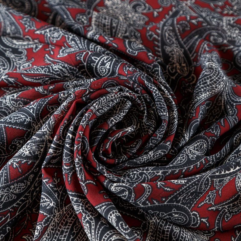 Шифон бордового оттенка с черно-белым принтом пейсли. Струящийся, летящий, воздушный, полупрозрачный. На ощупь мягкий и приятный. Подойдет для пошива тончайших воздушных блуз, изумительных платьев со сборками и воланами и элегантных шарфов.