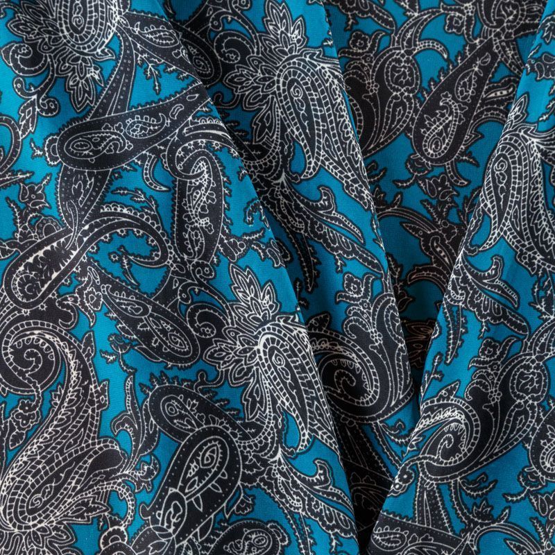 Шифон синего оттенка с черно-белым принтом пейсли. Струящийся, летящий, воздушный, полупрозрачный. На ощупь мягкий и приятный. Подойдет для пошива тончайших воздушных блуз, изумительных платьев со сборками и воланами и элегантных шарфов.