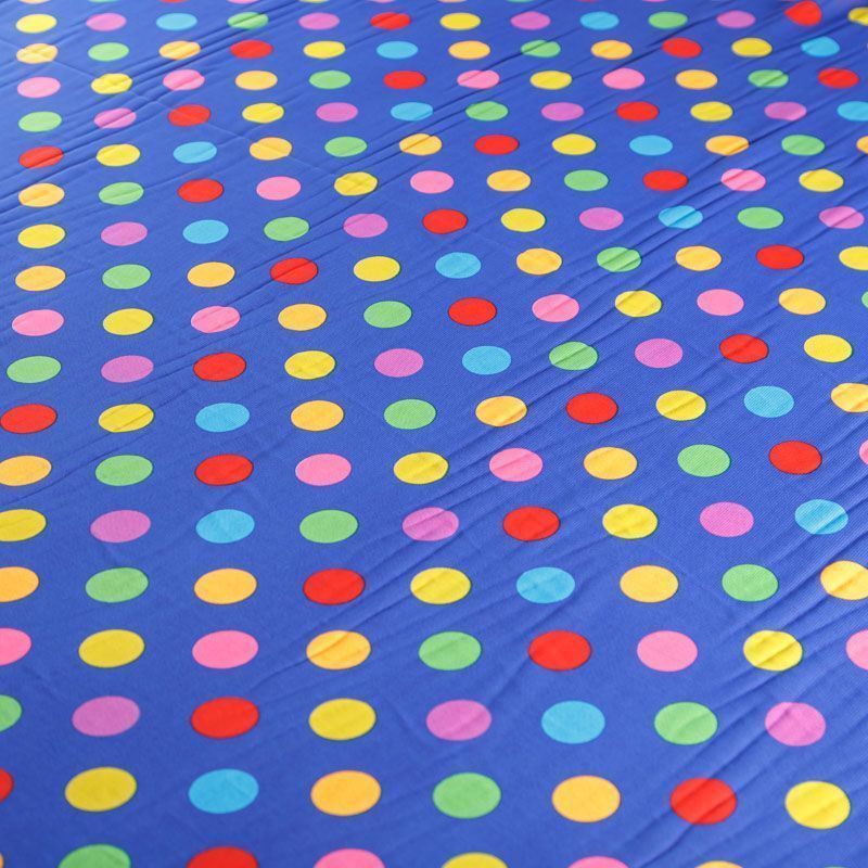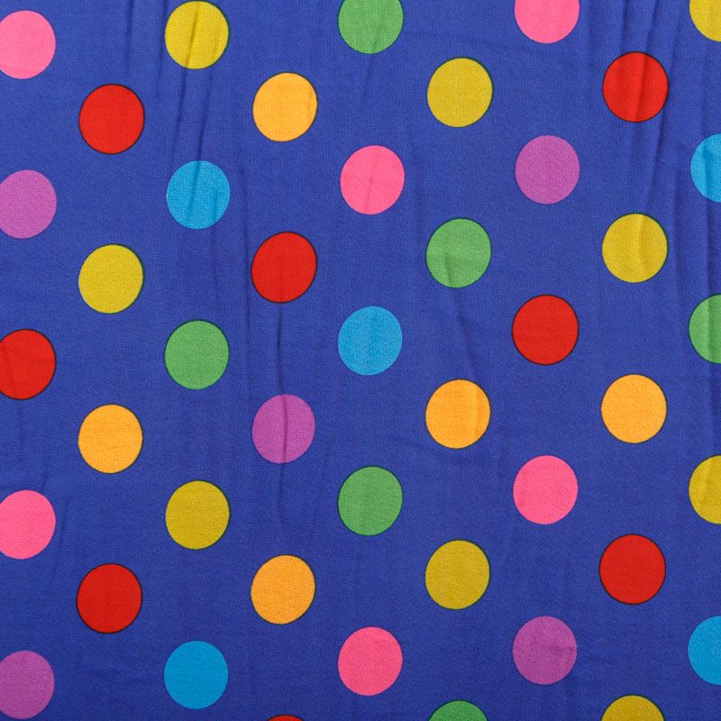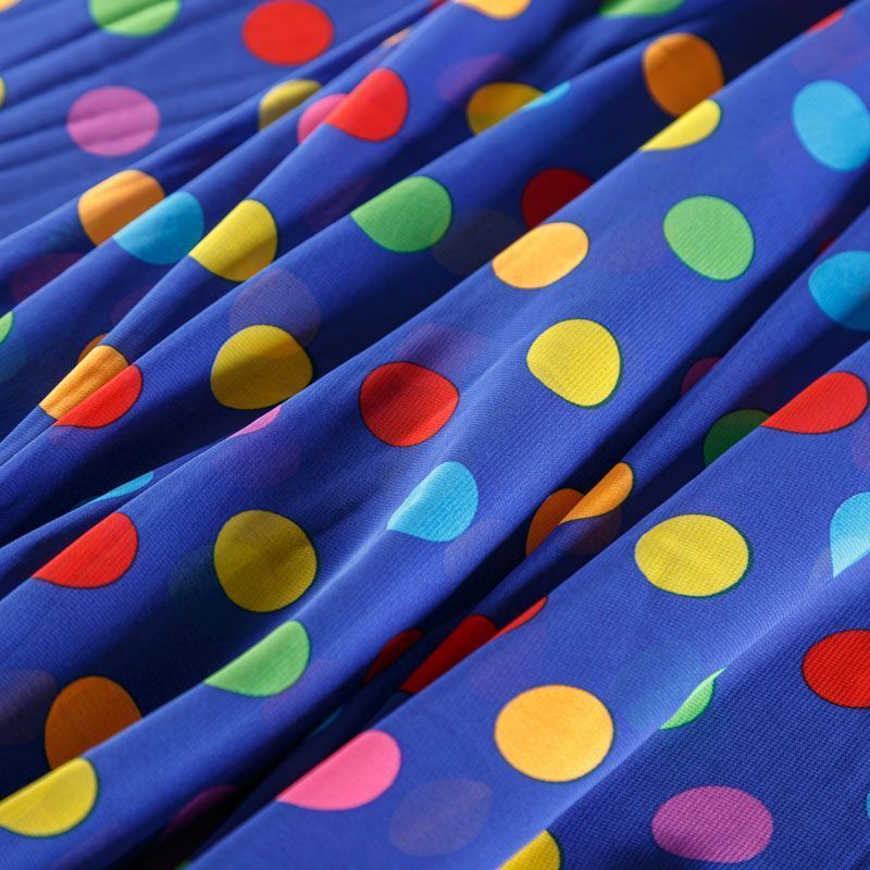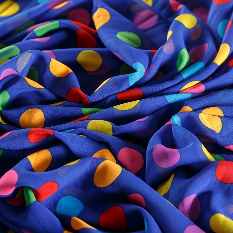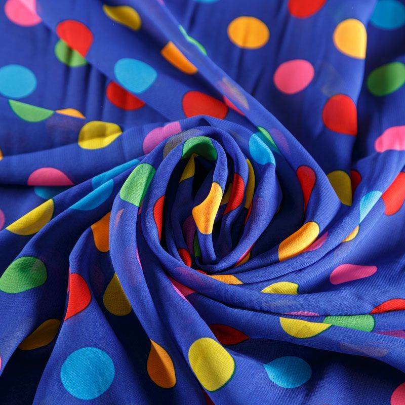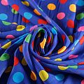 Шифон в синем оттенке с разноцветными горохами. Струящийся, летящий, воздушный, полупрозрачный. На ощупь мягкий и приятный.Подойдет для пошива тончайших воздушных блуз, изумительных платьев со сборками и воланами и элегантных шарфов.