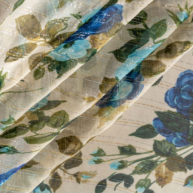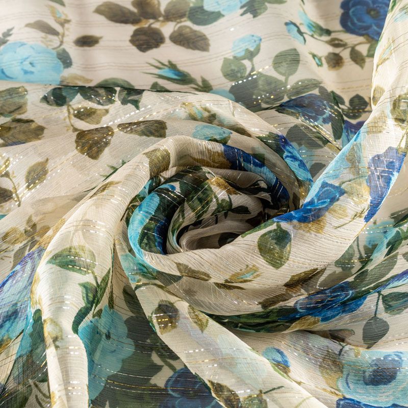 Шелковый шифон сливочного цвета с серебристым люрексом и цветочным принтом сине-зеленых оттенков. Струящийся, летящий, воздушный, полупрозрачный. На ощупь мягкий и приятный.Подойдет для пошива тончайших воздушных блуз, изумительных вечерних платьев и элегантных шарфов.