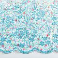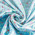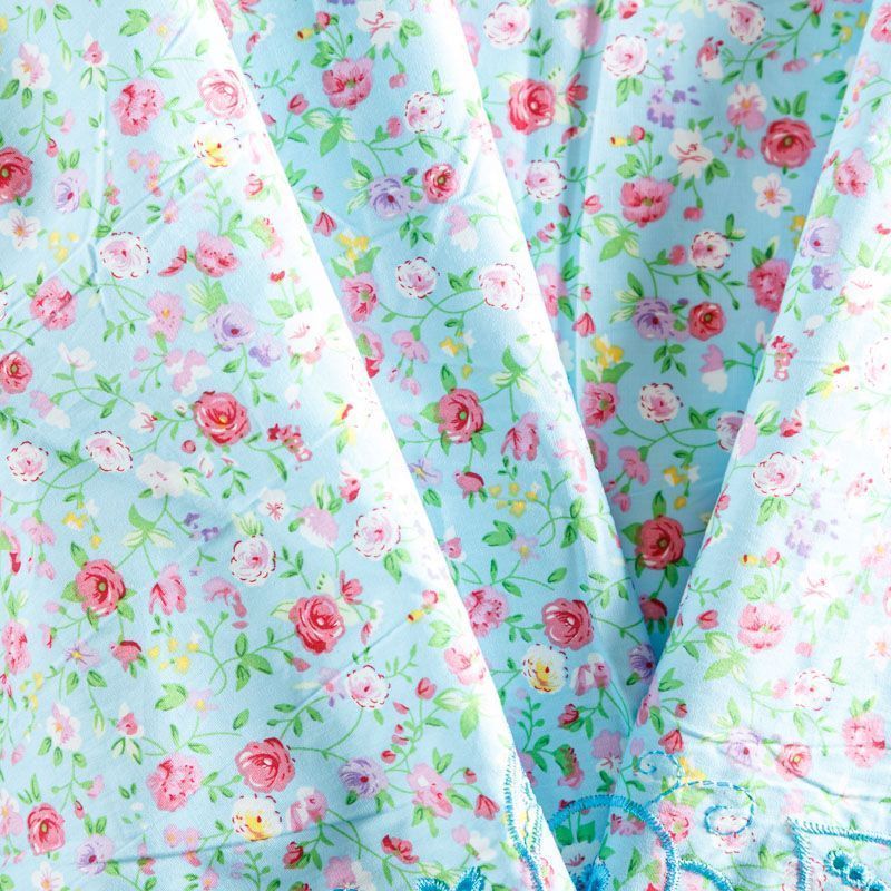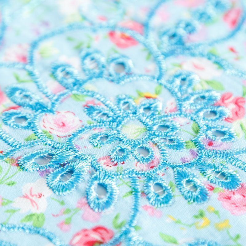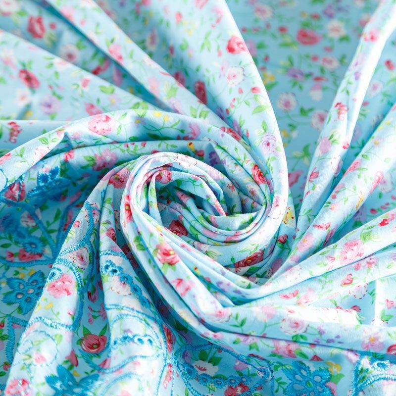 Мягкий и нежный хлопок голубого оттенка с мелким романтичным цветочным принтом украшен изящной вышивкой и перфорацией.  Узор выполнен путём машинной вышивки нитками в цвет ткани и расположен вдоль одной кромки, поэтому набирается на изделие объемом. Ткань тонкая, легкая, не сухая, имеет тенденцию к сминаемости, не много просвечивает, не тянется, приятная на ощупь. Идеально подходит для создания летних платьев, сарафанов, юбок, блузок, топов, шорт.