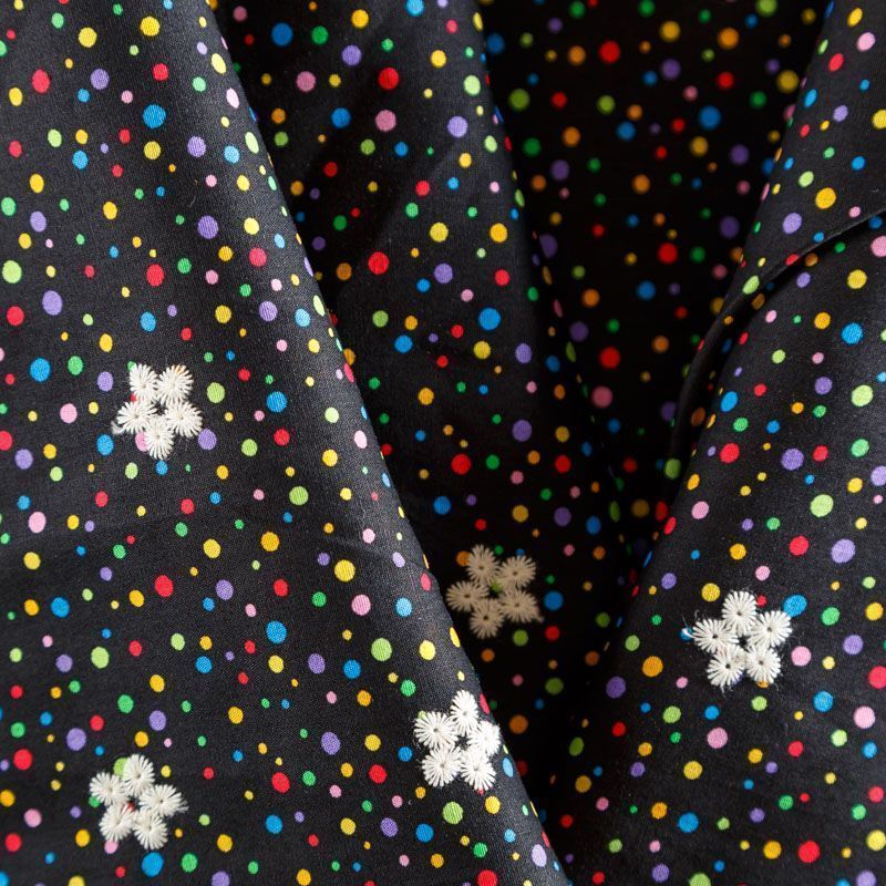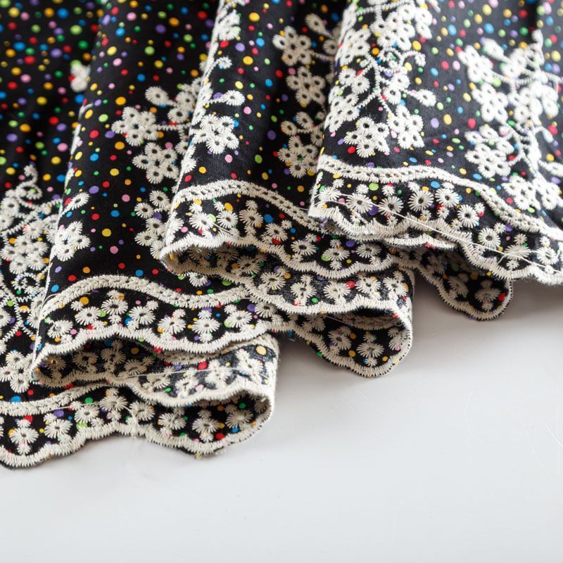 Мягкий и нежный хлопок черного цвета с мелким цветным принтом принтом украшен контрастной вышивкой. Узор выполнен путём машинной вышивки и расположен вдоль одной кромки, образуя фестон, поэтому набирается на изделие объемом. Ткань легкая, не сухая, хорошо драпируется и держит форму, имеет тенденцию к сминаемости, не просвечивает, не тянется, приятная на ощупь. Идеально подходит для создания летних платьев, сарафанов, юбок, блузок, топов, шорт.