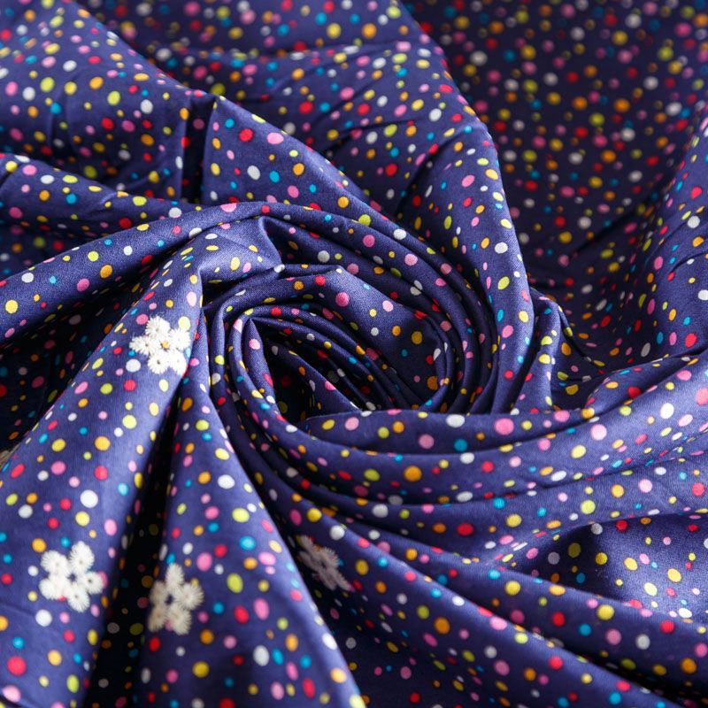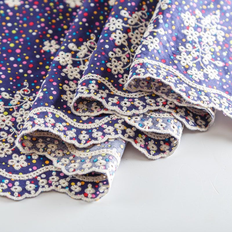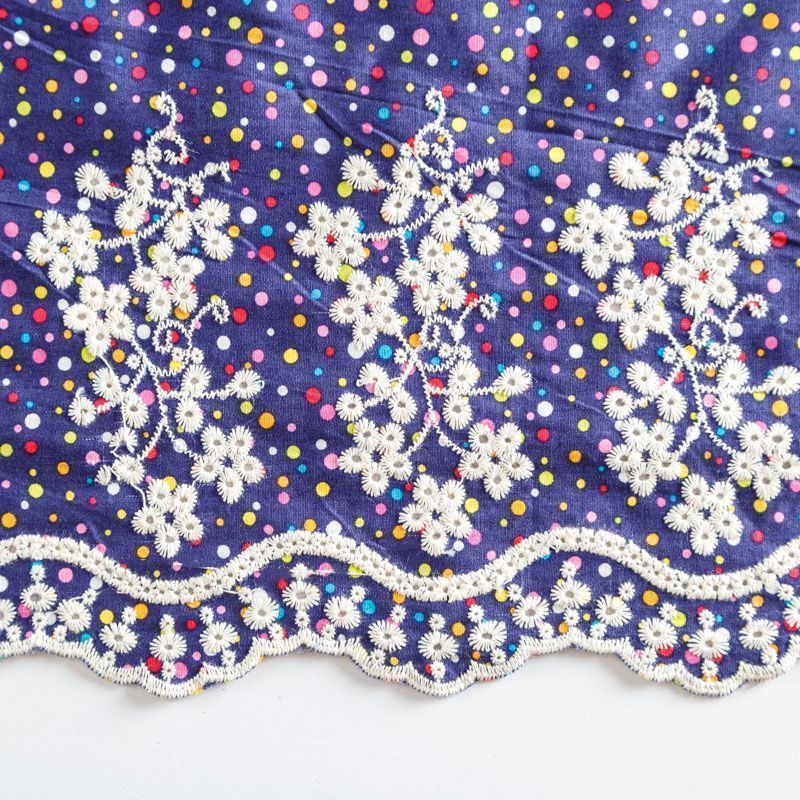 Мягкий и нежный хлопок синего цвета с мелким цветным принтом принтом украшен контрастной вышивкой.  Узор выполнен путём машинной вышивки и расположен вдоль одной кромки, образуя фестон, поэтому набирается на изделие объемом. Ткань легкая, не сухая, хорошо драпируется и держит форму, имеет тенденцию к сминаемости, не просвечивает, не тянется, приятная на ощупь. Идеально подходит для создания летних платьев, сарафанов, юбок, блузок, топов, шорт.