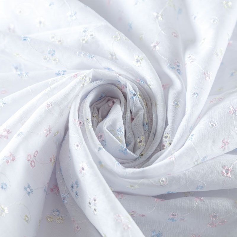 Мягкий и нежный хлопок белоснежного оттенка с вышивкой и перфорацией. Узор выполнен путём машинной вышивки разноцветными нитками и расположен по всему полотну. Фактура ткани однородная, имеет тенденцию к сминаемости, не тянется, приятная на ощупь. Может потребоваться подклад. Идеально подходит для создания летних платьев, сарафанов, юбок, блузок и топов.