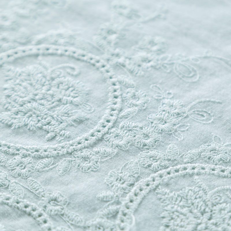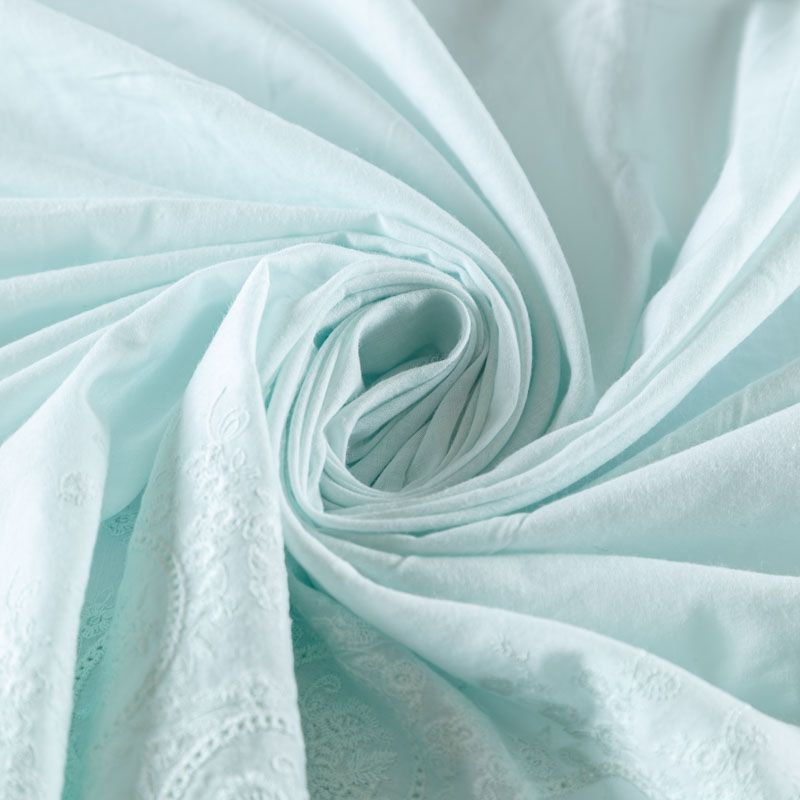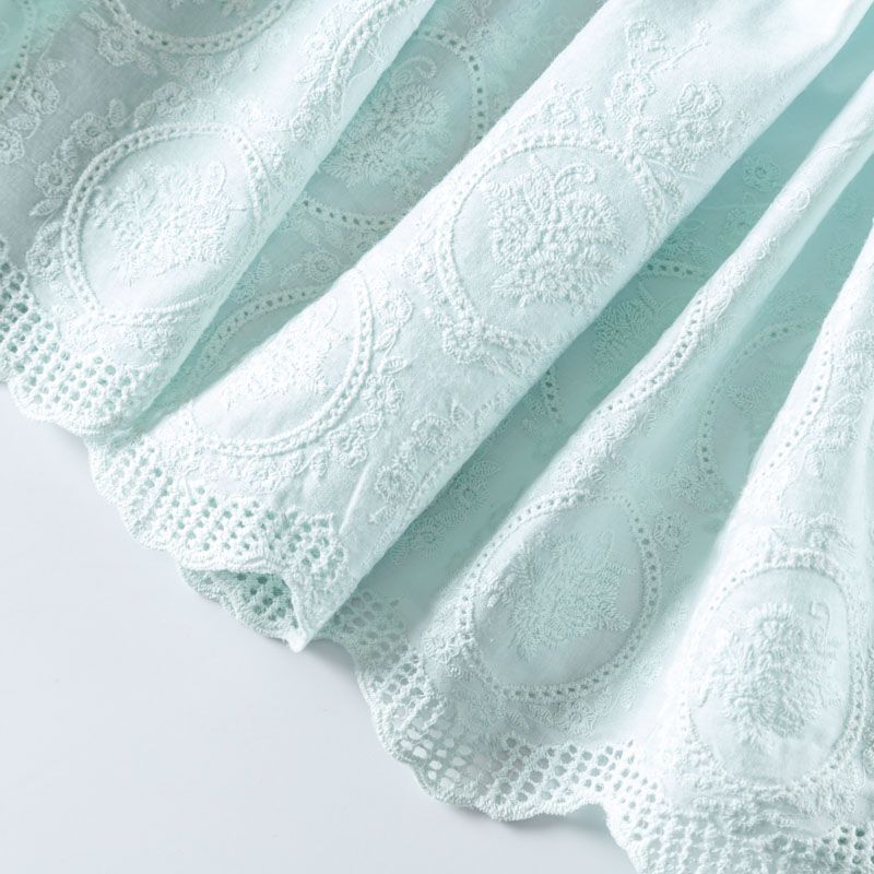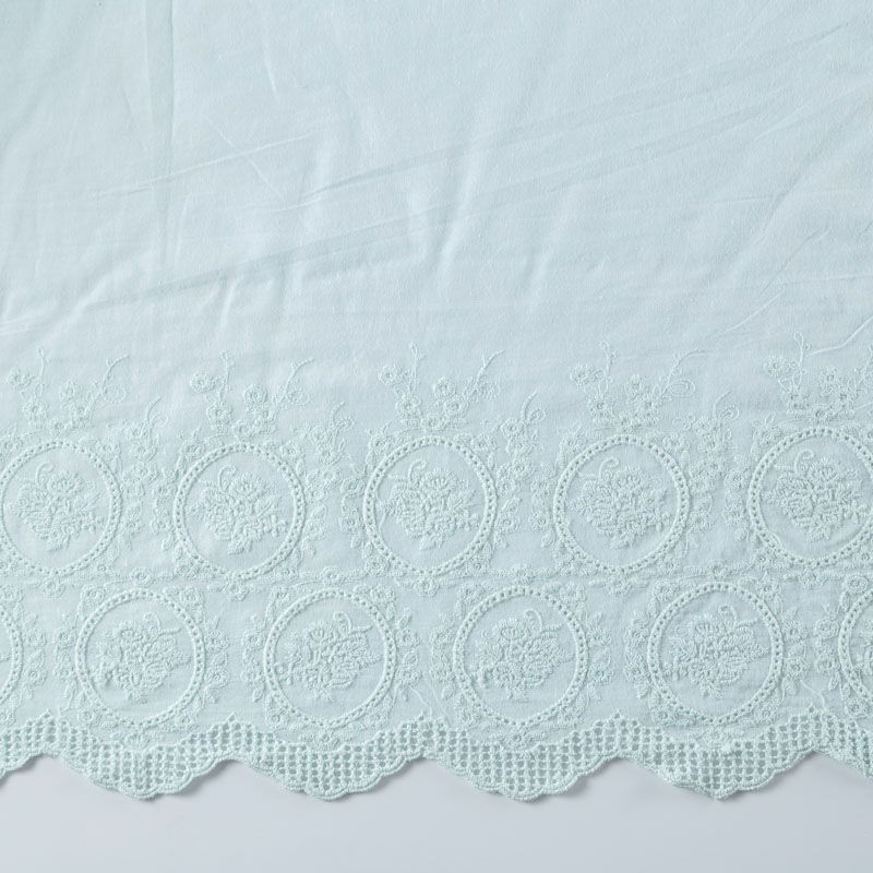 Мягкий и нежный хлопок мятного оттенка с изящной вышивкой. Узор выполнен путём машинной вышивки нитками в цвет ткани и расположен вдоль кромки. Фактура ткани однородная, имеет тенденцию к сминаемости, просвечивает, не тянется, приятная на ощупь. Идеально подходит для создания летних платьев, сарафанов, юбок, блузок и топов.