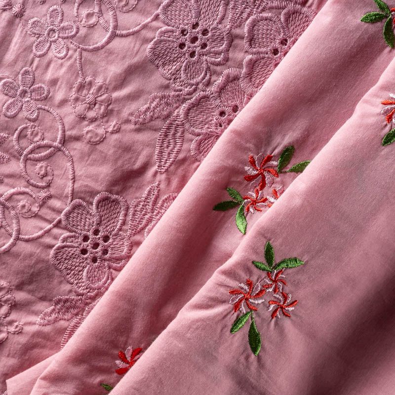 Мягкий хлопок темно-розового оттенка с яркой цветочной вышивкой. Фактура ткани гладкая, имеет тенденцию к сминаемости, немного просвечивает, не тянется, приятная на ощупь. Хлопок прекрасно пропускает воздух, идеально подходит для создания летних платьев, сарафанов, юбок, блузок и топов. Ткань идет купоном (каймой) вдоль одной кромки. Купон выполнен путём машинной вышивки нитками в цвет ткани. Набирается объемом.