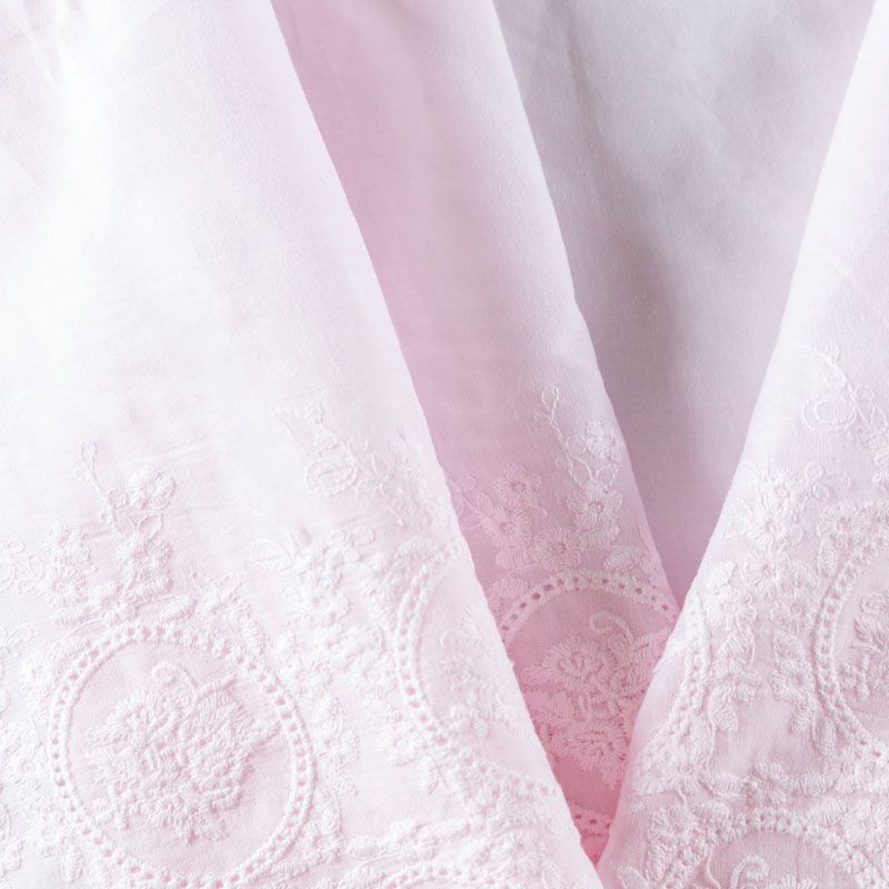 Мягкий и нежный хлопок розового оттенка с изящной вышивкой. Узор выполнен путём машинной вышивки нитками в цвет ткани и расположен вдоль кромки. Фактура ткани однородная, имеет тенденцию к сминаемости, просвечивает, не тянется, приятная на ощупь. Идеально подходит для создания летних платьев, сарафанов, юбок, блузок и топов.