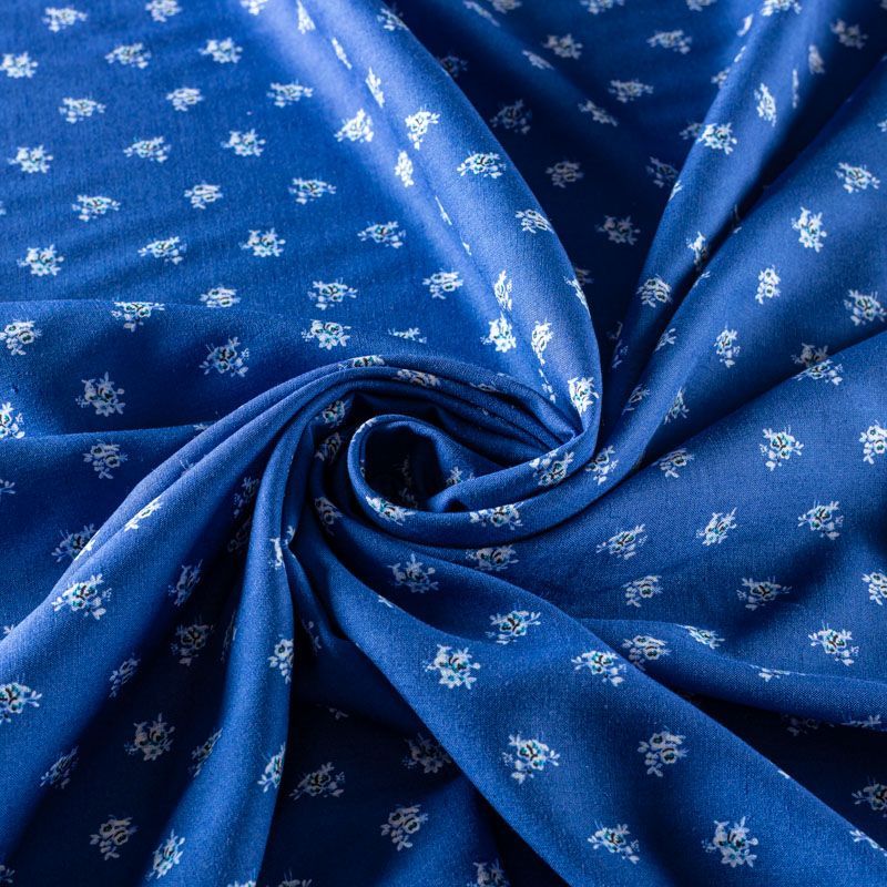 Плательно-блузочный штапель с мелким цветочным принтом на синем джинсовом фоне. Мягкий, тонкий, нежный, пластичный, приятный на ощупь, хорошо драпируется, практичный. Подойдет для пошива платья, топа, блузки, рубашки, юбки, летних брюк.