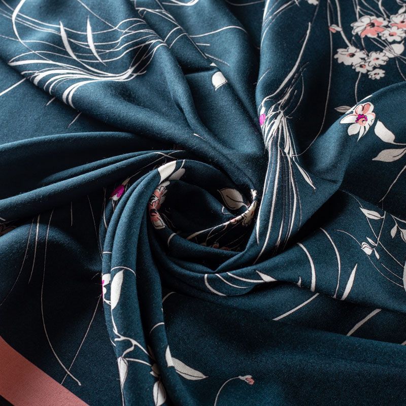 Итальянский плательно-блузочный штапель глубокого сине-зеленого оттенка с цветочным принтом и декоративным кантом вдоль кромки. Мягкий, нежный, пластичный, приятный на ощупь, хорошо драпируется, практичный. Особенно актуален летом, он очень легкий, обволакивающий прохладой. Идеален для пошива летней детской одежды, сарафанов, платьев, юбок, блузок, домашней одежды: халатов, ночной пижамы.