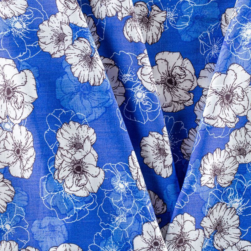 Плательно-блузочный штапель с черно-белым цветочным принтом на васильковом фоне. Ткань мягкая, тонкая, нежная, пластичная, приятная на ощупь, хорошо драпируется, практичная, поверхность слегка фактурная. Подойдет для пошива платья, топа, блузки, рубашки, юбки, летних брюк.