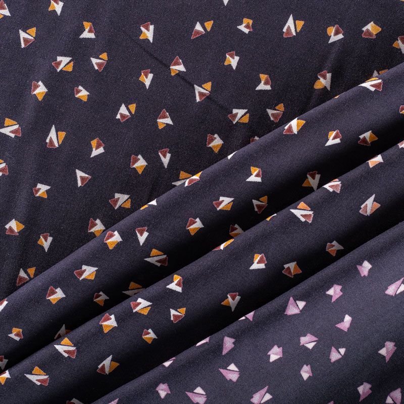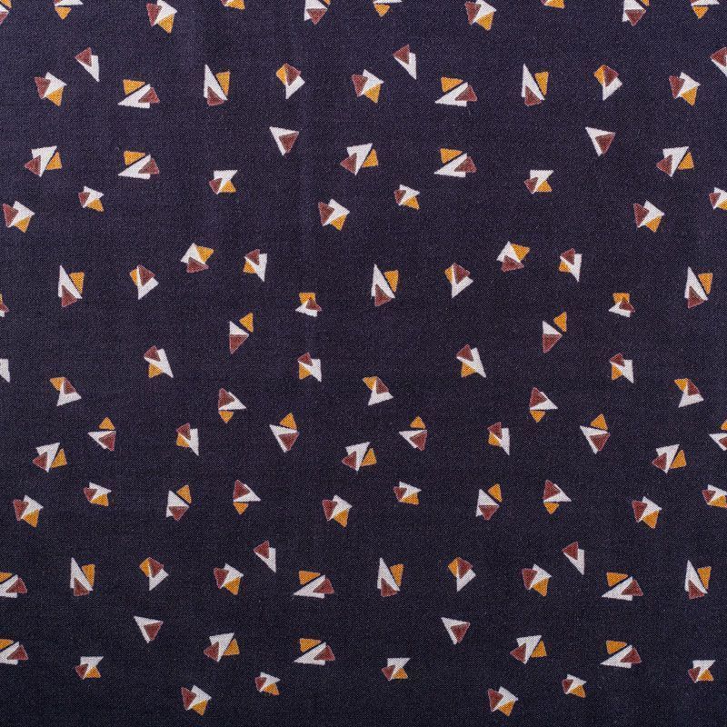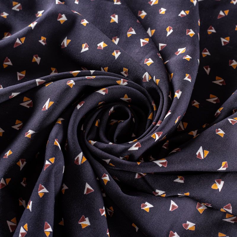 Плательно-блузочный штапель с мелким геометрическим принтом на темно-синем фоне. Мягкий, тонкий, нежный, пластичный, приятный на ощупь, хорошо драпируется, практичный. Подойдет для пошива платья, топа, блузки, рубашки, юбки, летних брюк.