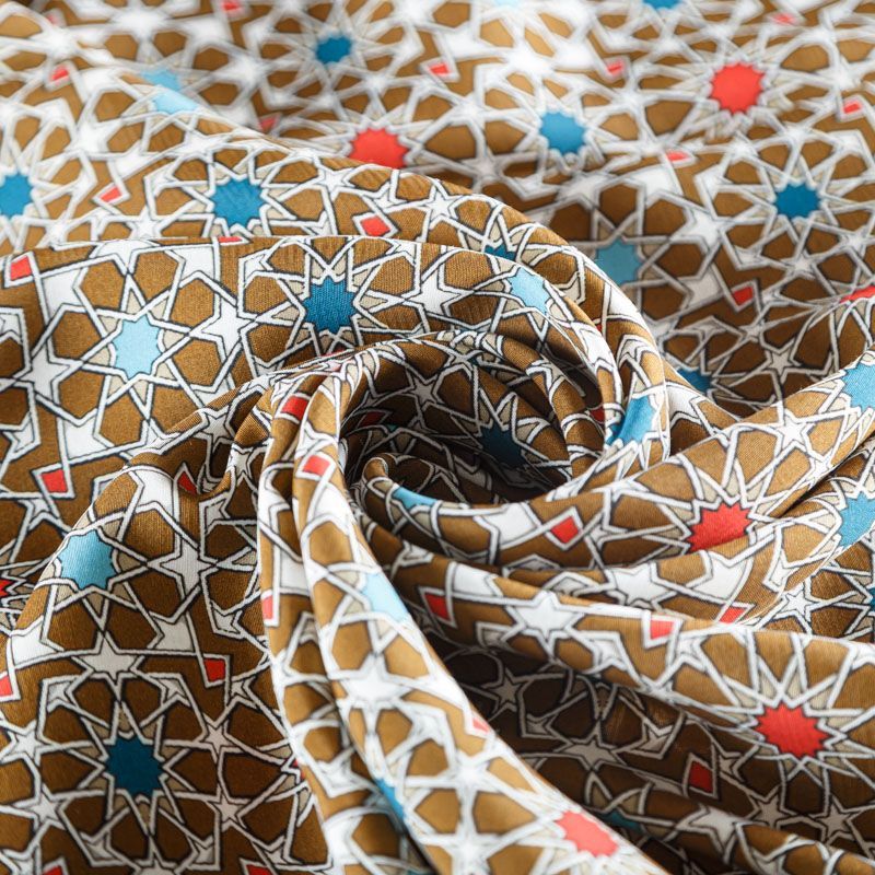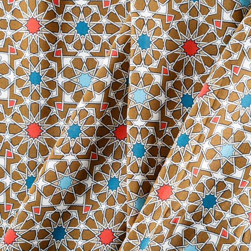 Плательно-блузочный штапель с абстрактным геометрическим принтом на фоне цвета хаки. Мягкий, тонкий, нежный, пластичный, приятный на ощупь, хорошо драпируется, практичный. Подойдет для пошива платья, топа, блузки, рубашки, юбки, летних брюк, комбинезона.