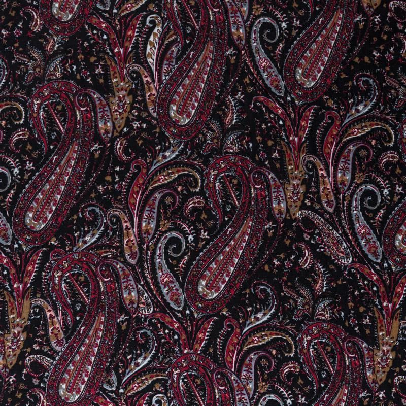 Плательно-блузочный штапель с принтом пейсли на черном фоне. Мягкий, тонкий, нежный, пластичный, приятный на ощупь, хорошо драпируется, практичный. Подойдет для пошива платья, топа, блузки, рубашки, юбки, летних брюк, комбинезона.