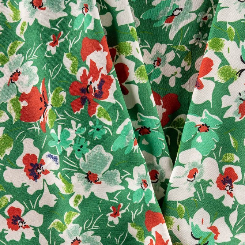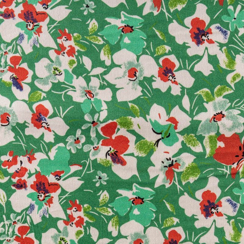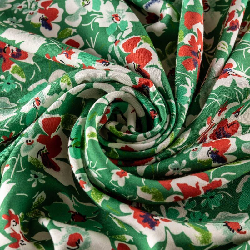Мягкий, нежный, пластичный, шелковистый на ощупь, хорошо драпируется, практичный. Особенно актуален летом, он очень легкий, обволакивающий прохладой. Идеален для пошива летней детской одежды, сарафанов, платьев, юбок, блузок, домашней одежды: халатов, ночной пижамы. На ярком зеленом фоне цветочный принт в молочно-коралловых оттенках.