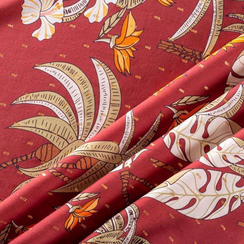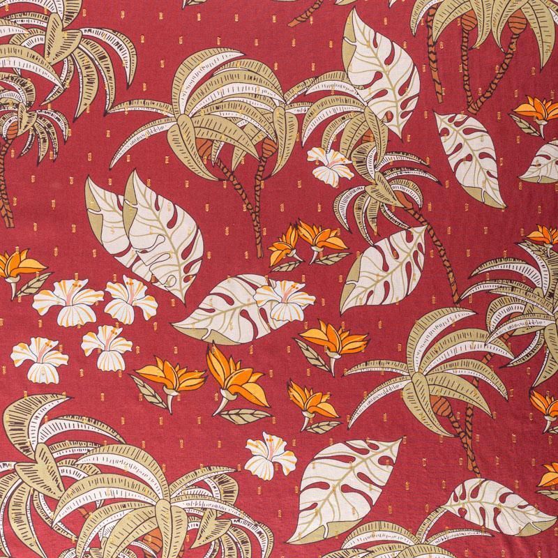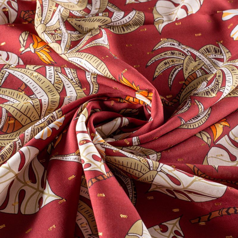 Плательно-блузочный штапель с фантазийным растительным принтом на терракотовом фоне декорирован ресничками из люрексовой нити. Мягкий, тонкий, нежный, пластичный, приятный на ощупь, хорошо драпируется, практичный. Подойдет для пошива платья, топа, блузки, рубашки, юбки, летних брюк.