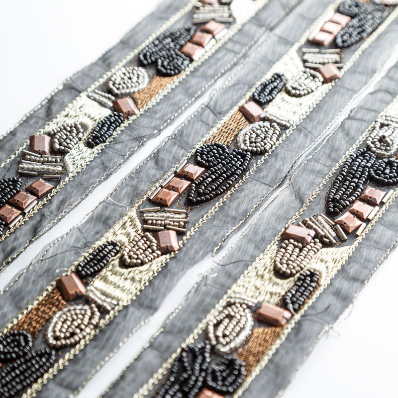 Тесьма представляет собой ленту из черной органзы , лицевая сторона которой декорирована вышивкой, бисером и бусинами. Используется для отделки трикотажа, платьев, рубашек, манжет, вечерней и свадебной одежды, верхней одежды, обуви, сумок, украшений, а также для сценических костюмов.