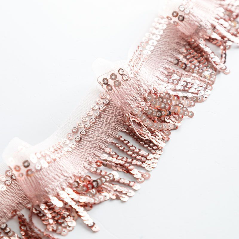 Тесьма выполнена в виде бахромы с мелкими пайетками. Можно использовать для отделки платьев, рубашек, манжет, вечерней и свадебной одежды, верхней одежды, обуви, сумок, украшений, предметов интерьера, а также для сценических костюмов.