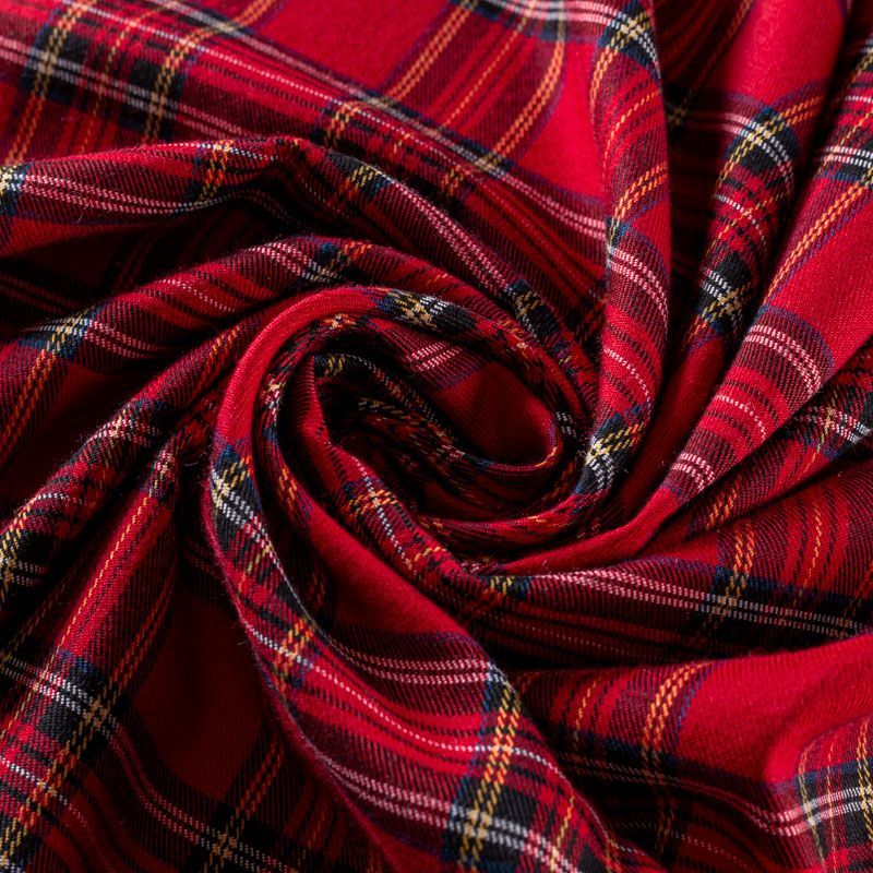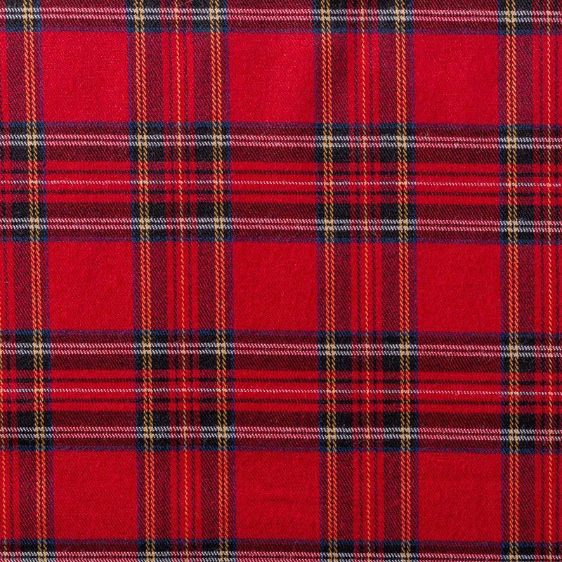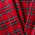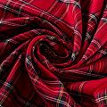 Костюмно-плательная ткань средней плотности, мягкая и приятная на ощупь, немного тянется за счет эластана в составе, держит форму,  хорошо драпируется и образует мягкие складки. Сочетание тонких линий желтого, синего, черного и белого цветов на ярком красном фоне образует сложную красивую клетку тартан. Ткань отлично подойдет на костюмы, юбки, брюки, шорты, платья, жакеты.