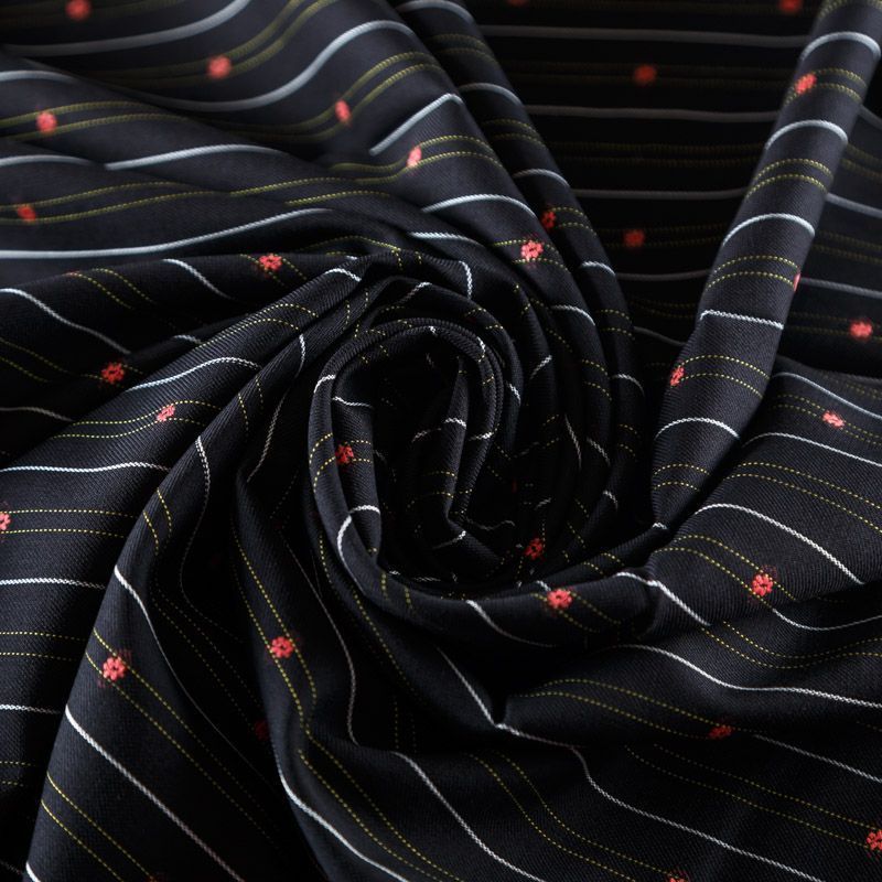 Итальяская костюмно-плательная шерстьс хлопком черного цвета в тонкую белую полоску и элементами вышивки. Ткань средней плотности, пластичная, очень приятная на ощупь, драпируется в слегка держащие форму складки, с полотняным переплетением, не тянется. Подойдет для всех видов изделий - платьев, сарафанов, модных жакетов, жилетов, брючных и юбочных костюмов, кюлотов, брюк-палаццо, юбок различных фасонов.