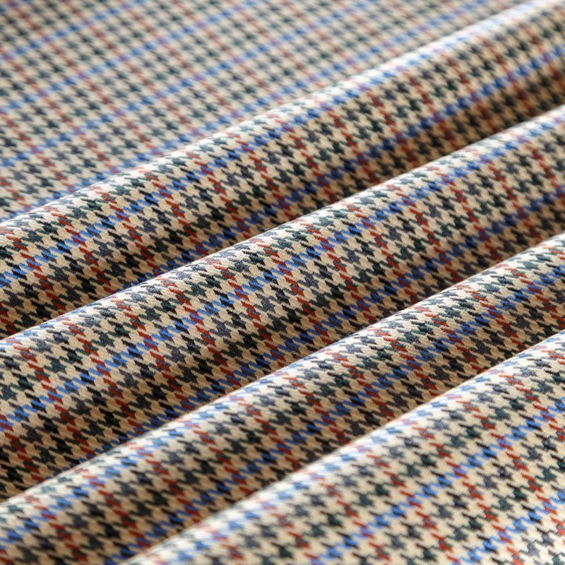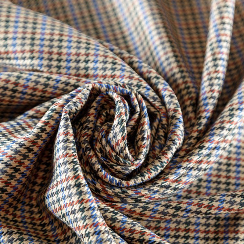 Итальянская костюмно-плательная шерсть средней плотности в актуальном бежевом оттенке с классическим узором гусиная лапка в черно-синиих цветах. Поверхность ткани имеет выраженное диагональное плетение, на ощупь гладкая, полированная благодаря содержанию шерсти ламы. Ткань очень мягкая, теплая, уютная, шерсть не колется, в носке очень комфортная. Подойдет для пошива стильного костюма, мужского пиджака, платья, жакета, юбки, шорт или легкого пальто для осенне-весеннего сезона.