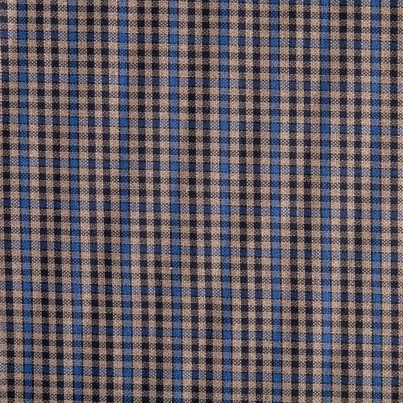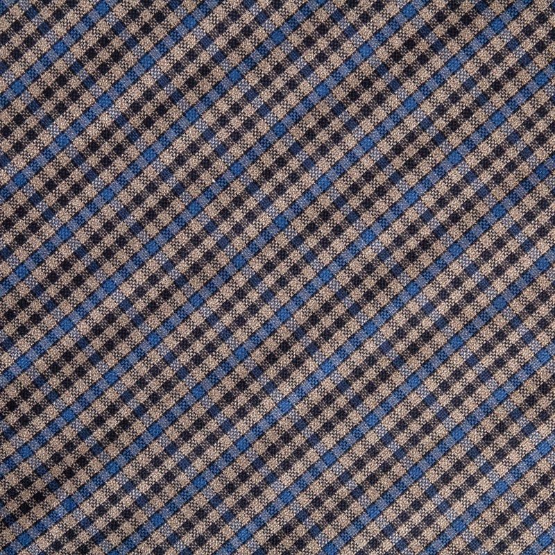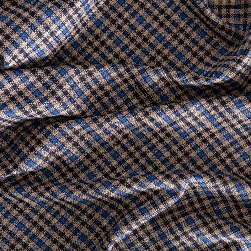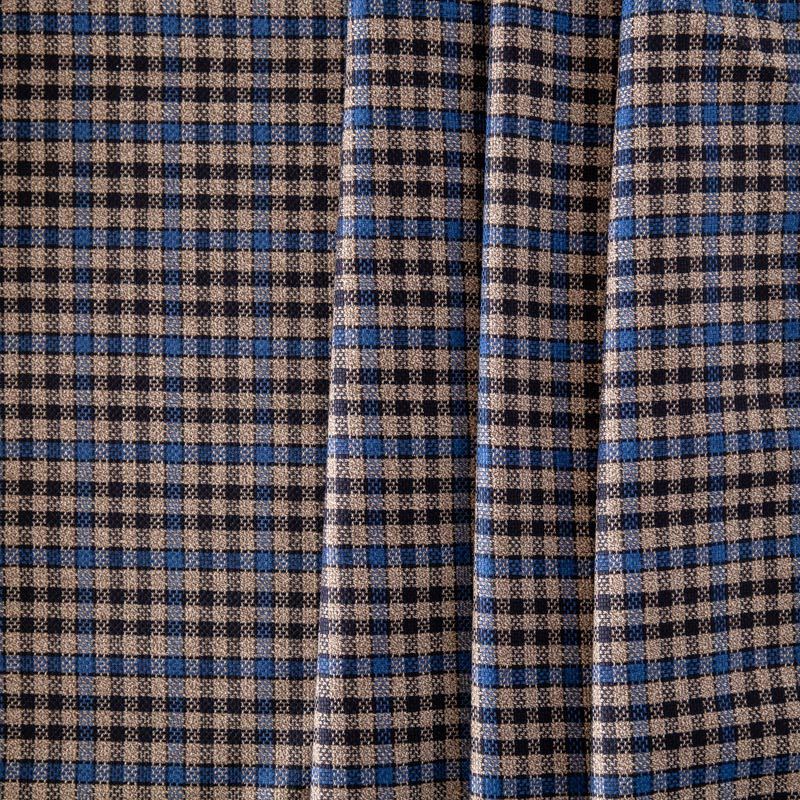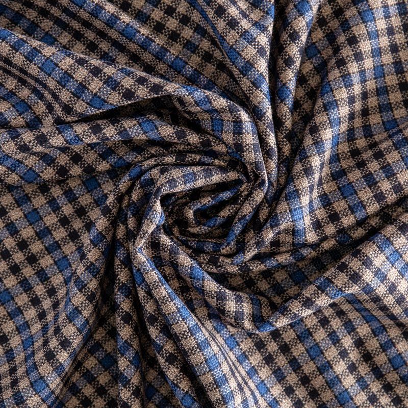 Сочетание линий черного, синего и серо-бежевого оттенков образует сложную мелкую клеточку. Прекрасно подойдет для пошива платья, сарафана, брюк, костюма, юбки, жакета любого фасона.