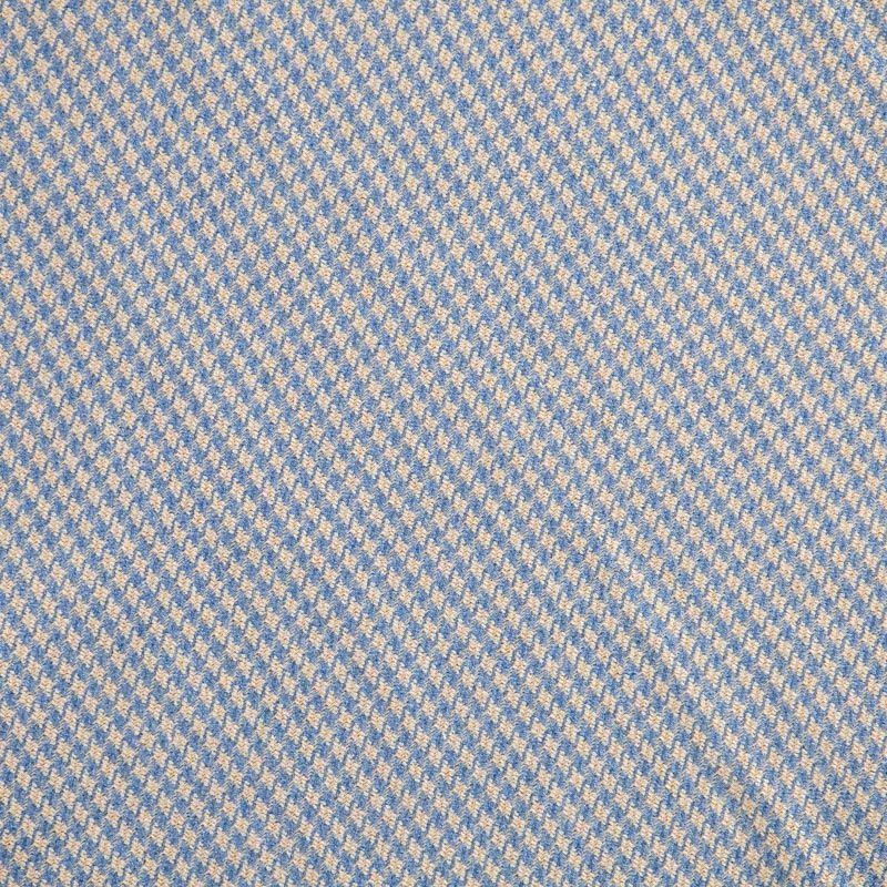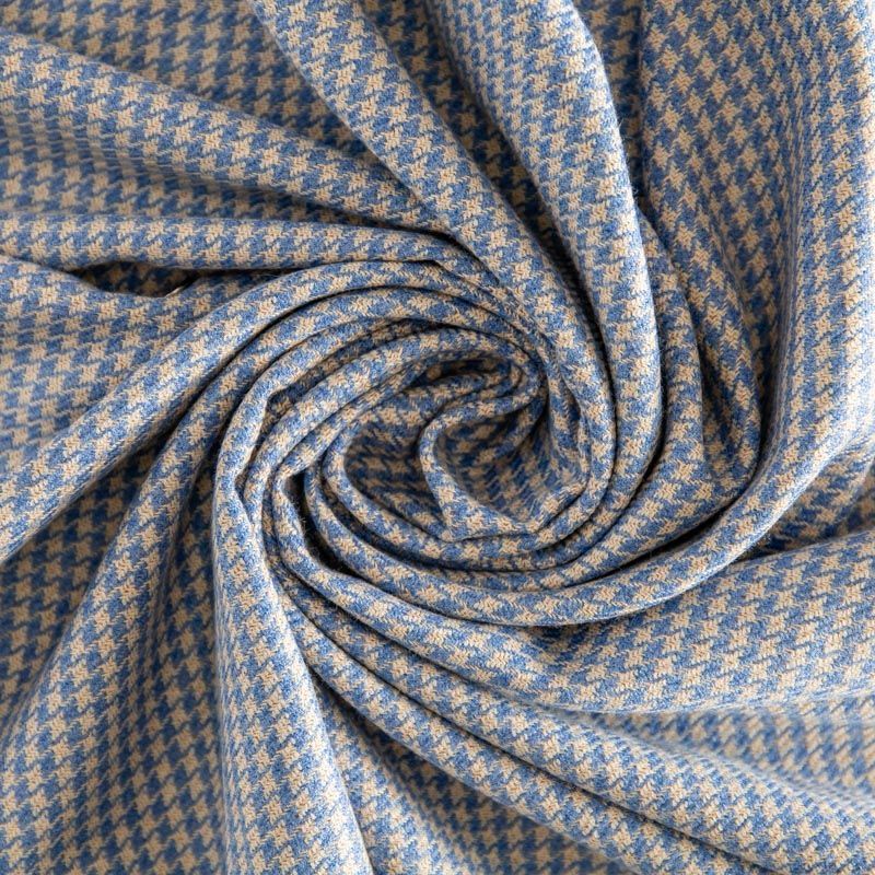 Костюмная ткань с уже классическим узором пье-де-пуль (гусиная лапка) песочно-голубого цвета. Рисунок образован за счёт жаккардового переплетения нитей. Материал мягкий, плотный, благодаря эластану изделия идеально сядут по фигуре и будут очень комфортные. Рекомендуем для пошива костюма, жакета, шорт или юбки.