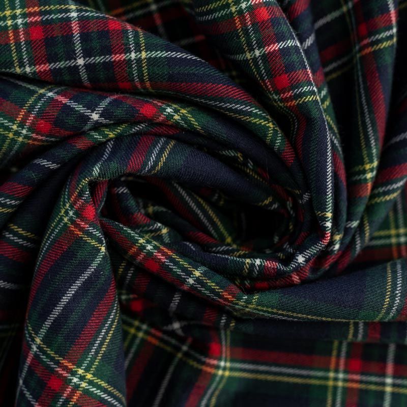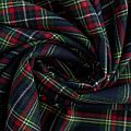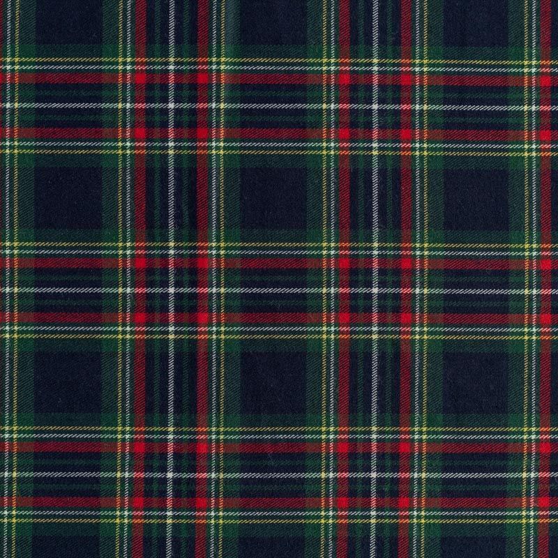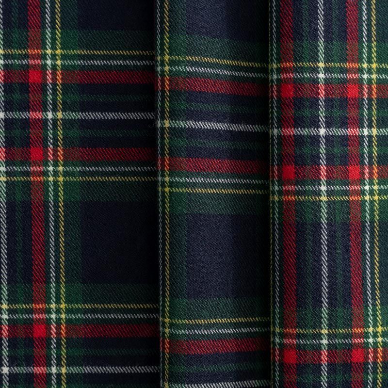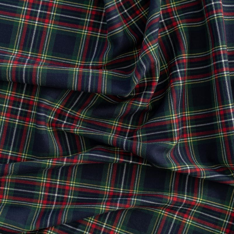 Ткань средней плотности, мягкая и приятная на ощупь, немного тянется, формоустойчива, хорошо драпируется и образует мягкие складки. Сочетание линий желтого, зеленого, красного и белого цветов на темно-синем фоне образует сложную красивую клетку тартан. Ткань отлично подойдет на костюмы, юбки, брюки, платья, жакеты, для школьной формы.