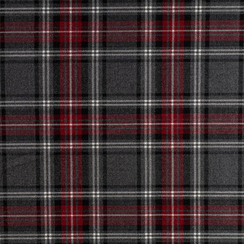 Ткань средней плотности, мягкая и приятная на ощупь, немного тянется, формоустойчива, хорошо драпируется и образует мягкие складки. Сочетание линий белого, черного и вишевого цветов на фактурном сером фоне образует сложную красивую клетку тартан. Ткань отлично подойдет на костюмы, юбки, брюки, платья, жакеты.