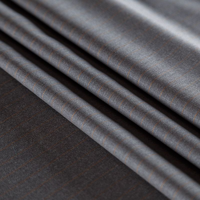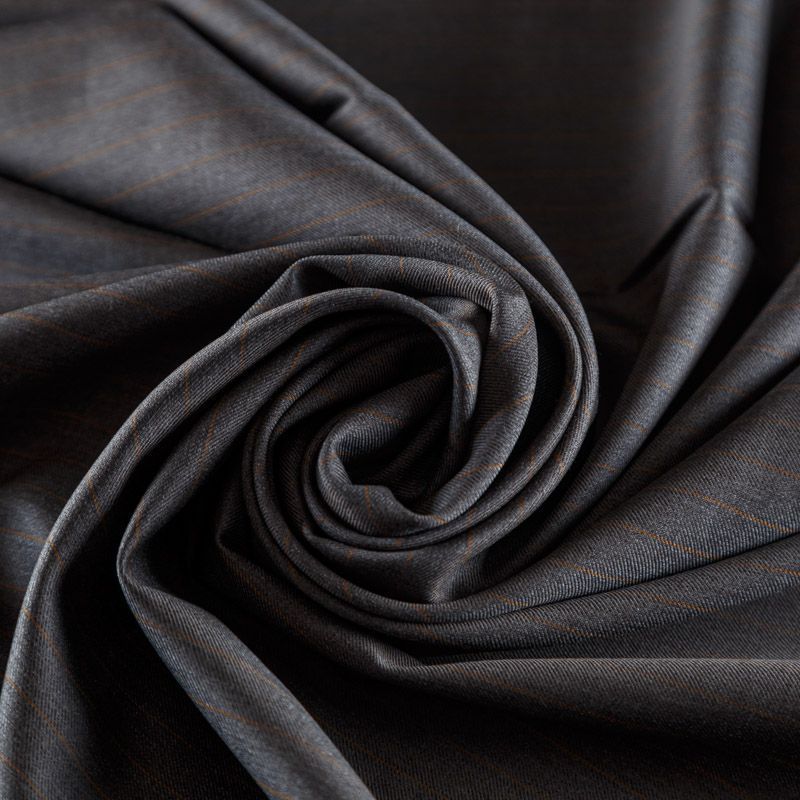 Итальянская шерстяная костюмно-плательная ткань средней плотности в сером оттенке в тонкую элегантную терракотовую полоску. Материал в меру мягкий и приятный на ощупь, немного тянется за счет эластана в составе, держит форму, хорошо драпируется и образует устойчивые складки. Ткань отлично подойдет на костюмы, юбки, брюки, платья, жакеты, для пошива школьной формы.