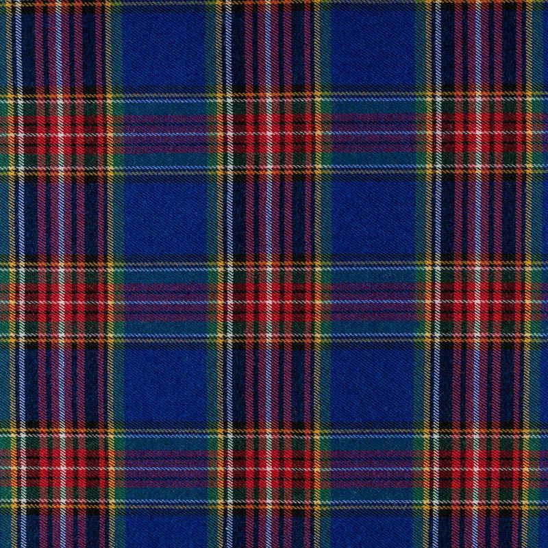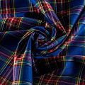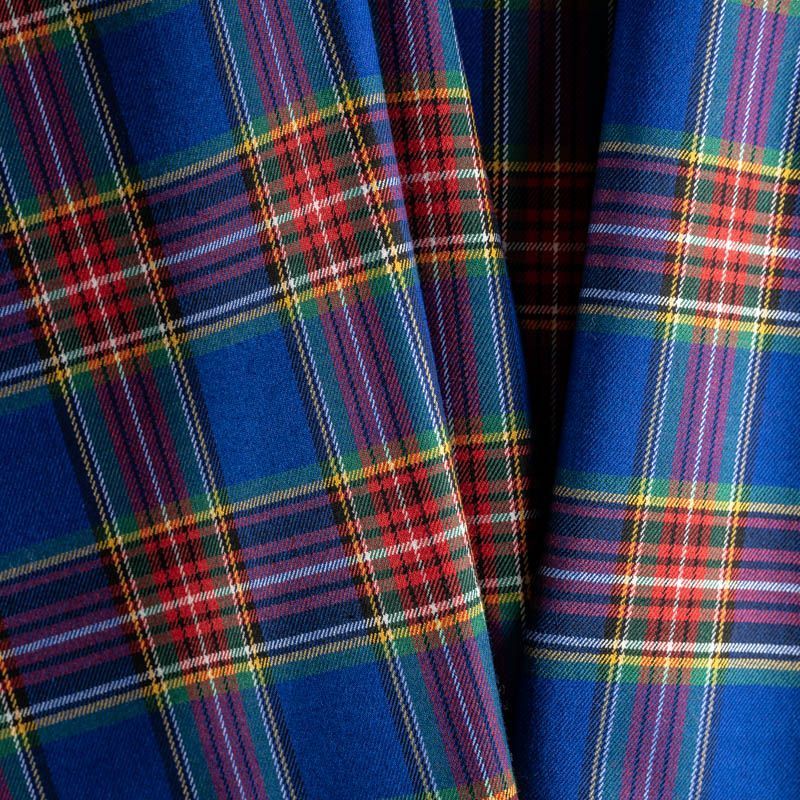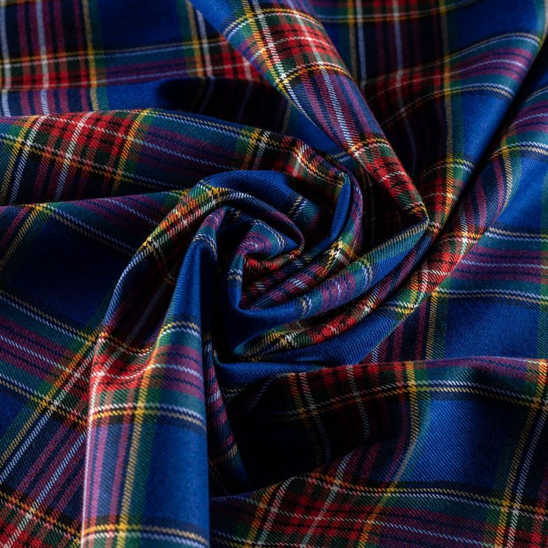 Ткань средней плотности, мягкая и приятная на ощупь, немного тянется, формоустойчива, хорошо драпируется и образует мягкие складки. Сочетание линий желтого, черного, зеленого, красного и белого цветов на ярком васильковом фоне образует сложную красивую клетку тартан. Ткань отлично подойдет на костюмы, юбки, брюки, платья, жакеты.