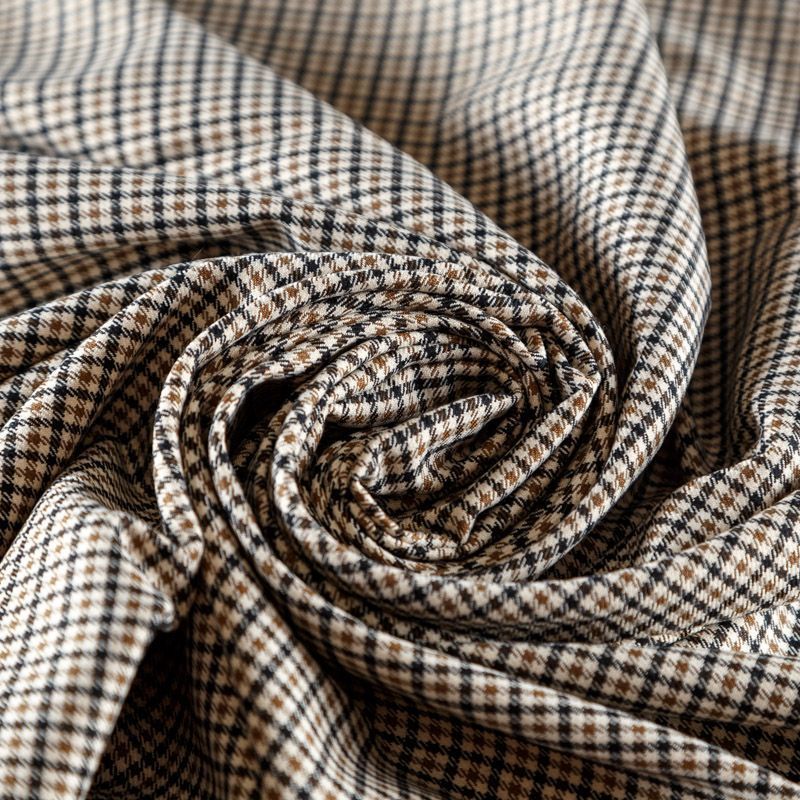 Костюмно-плательная поливискоза в бежевом оттенке в мелкую клетку. Ткань пластичная, очень приятная на ощупь, драпируется в слегка держащие форму складки. Подойдет для всех видов изделий - платьев, сарафанов, модных жакетов, жилетов, брючных и юбочных костюмов, кюлотов, брюк-палаццо, шорт, юбок различных фасонов.