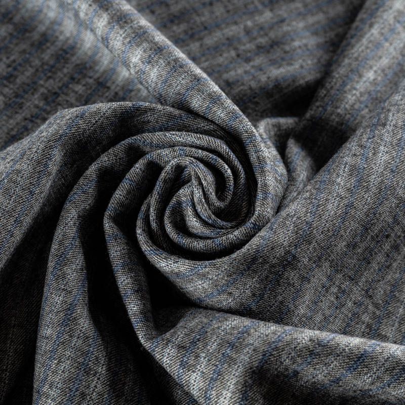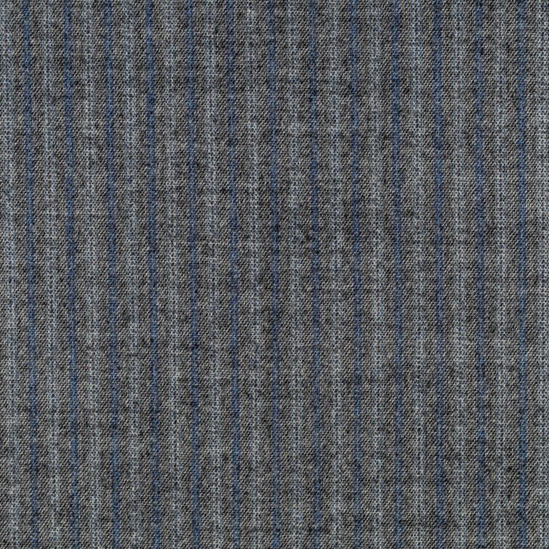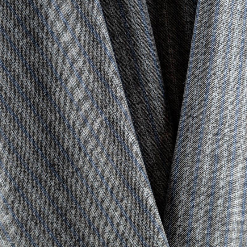 Костюмно-плательная шерсть шикарного качества, средней плотности, очень приятная на ощупь, драпируется в слегка держащие форму складки. Спокойный серый фон разбавлен тонкими полосками белого и синего оттенков. Подойдет для всех видов изделий - платьев, сарафанов, модных жакетов, жилетов, брючных и юбочных костюмов, кюлотов, брюк-палаццо, юбок различных фасонов.
